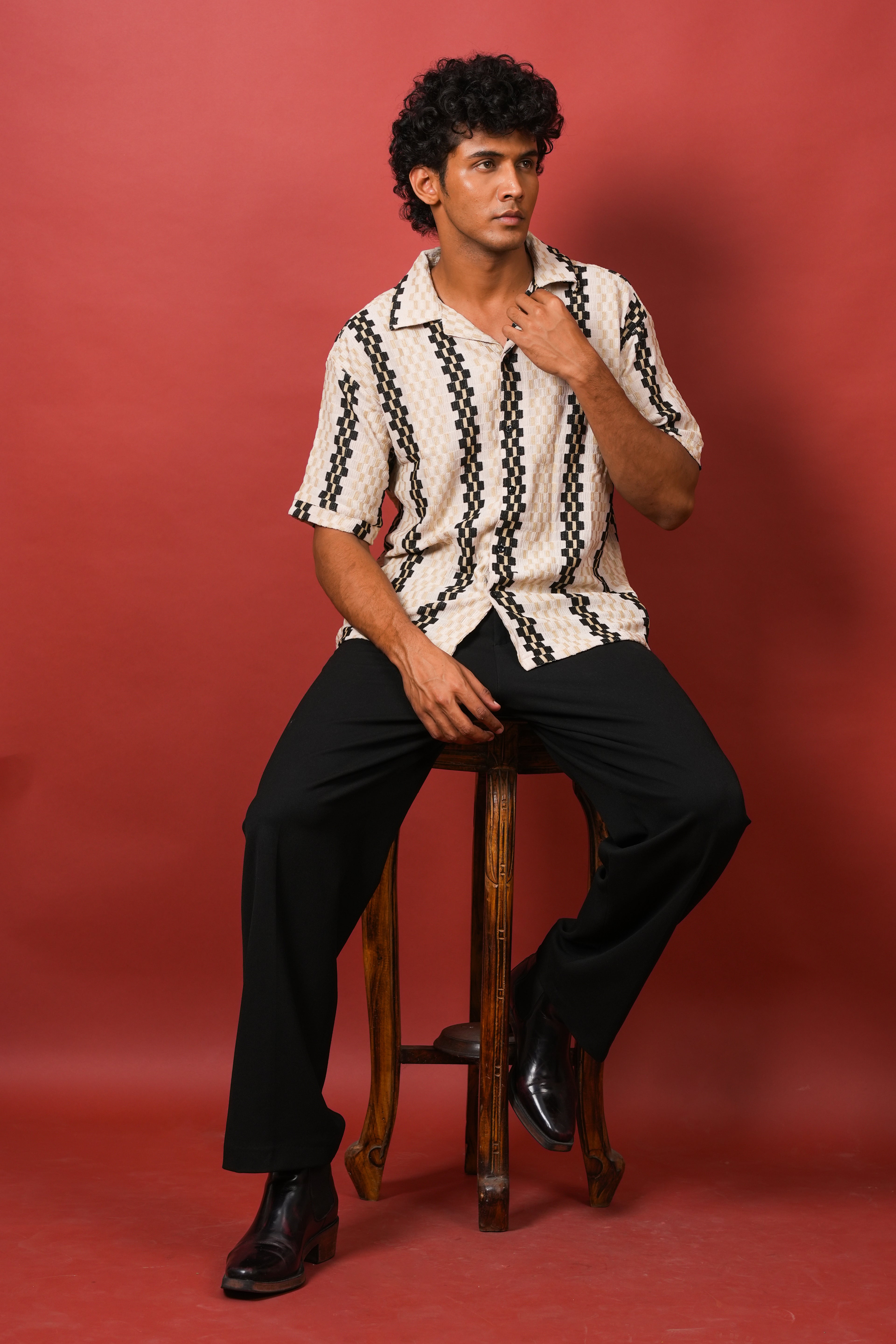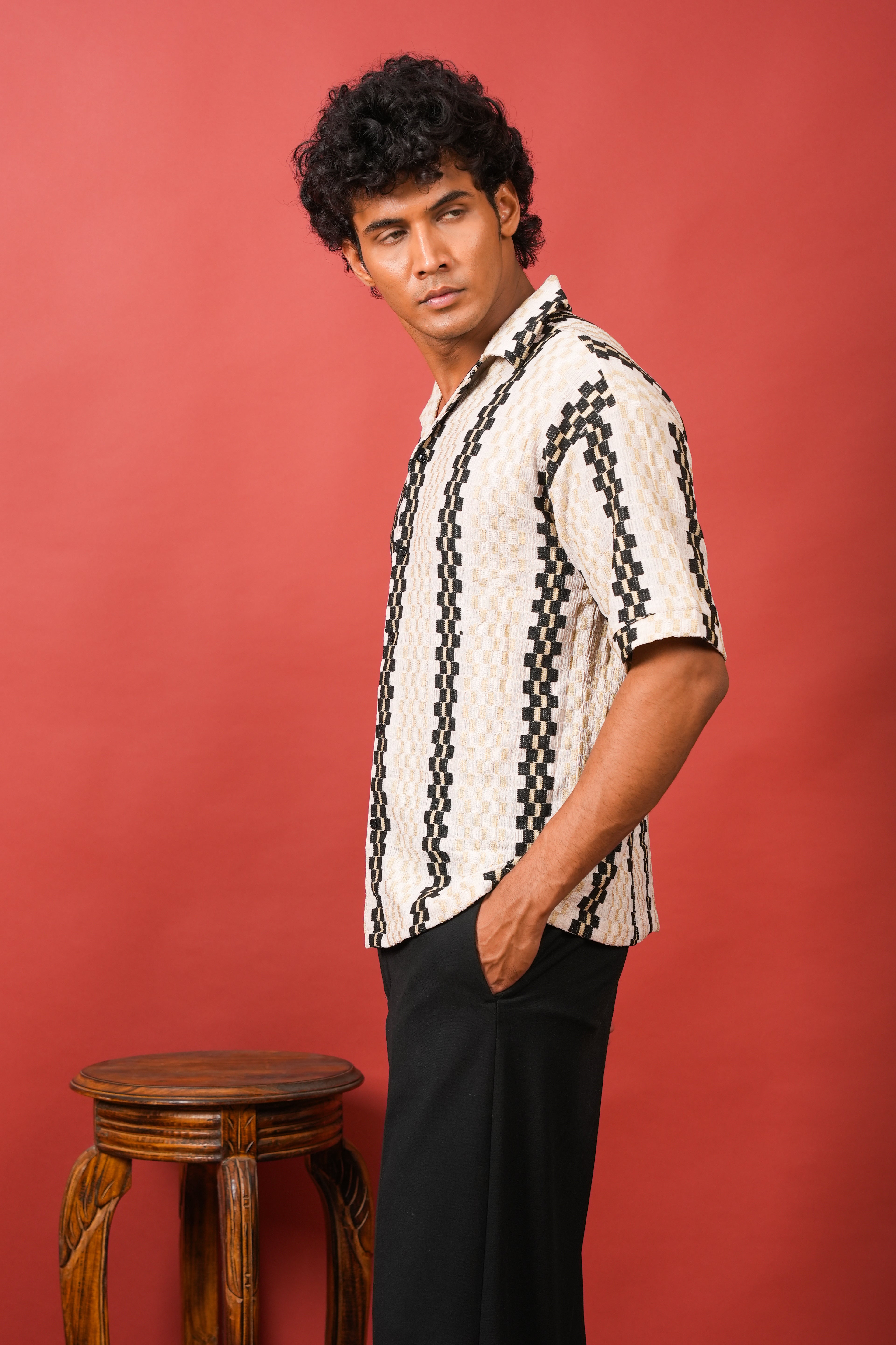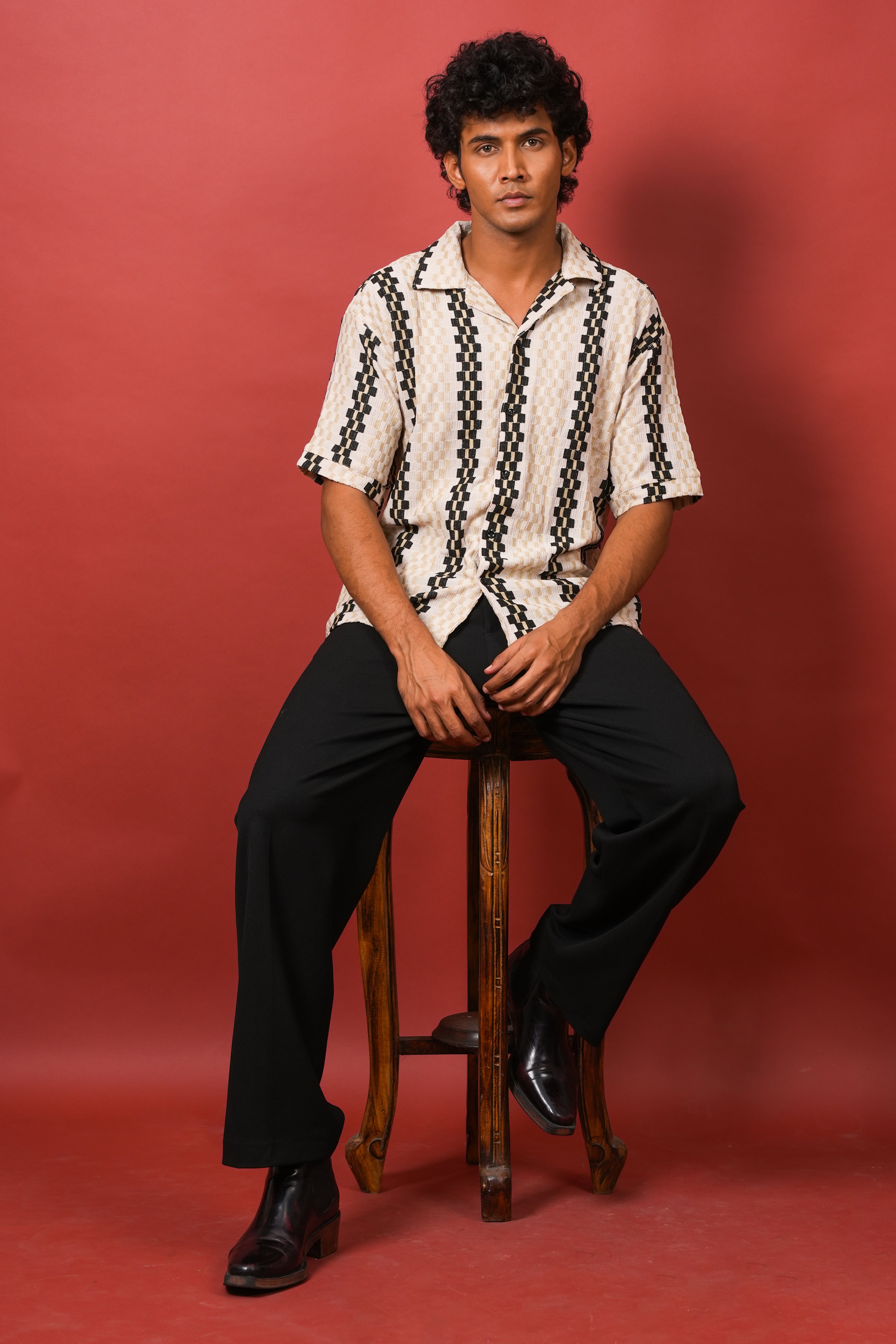 Relaxed-fit resort shirt in beige with bold black printed stripes. Features short sleeves, an open collar, and a breathable fabric ideal for holidays, casual evenings, or weekend getaways.