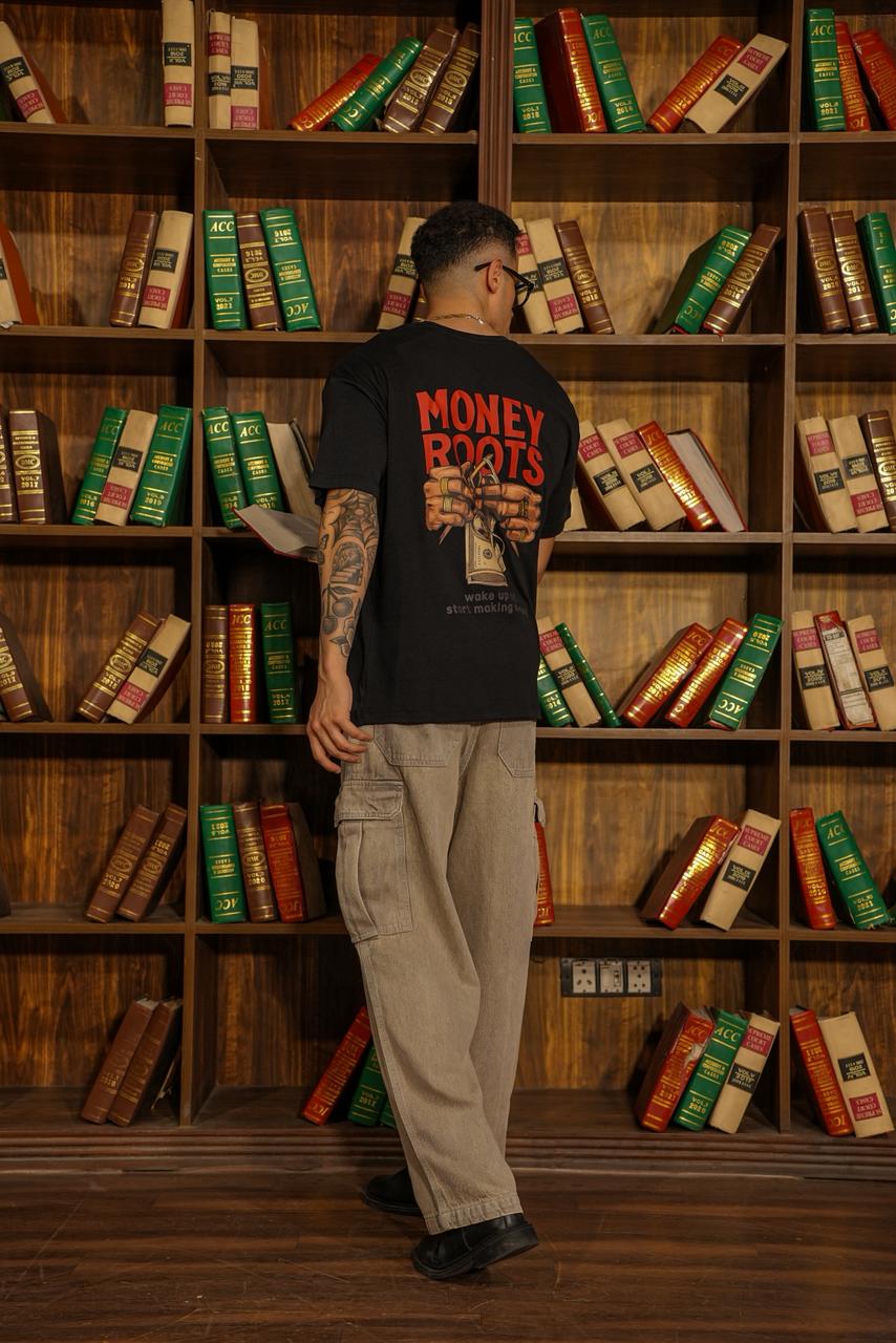 High-impact street tee with bold red typography and graphic of hands holding cash roots.