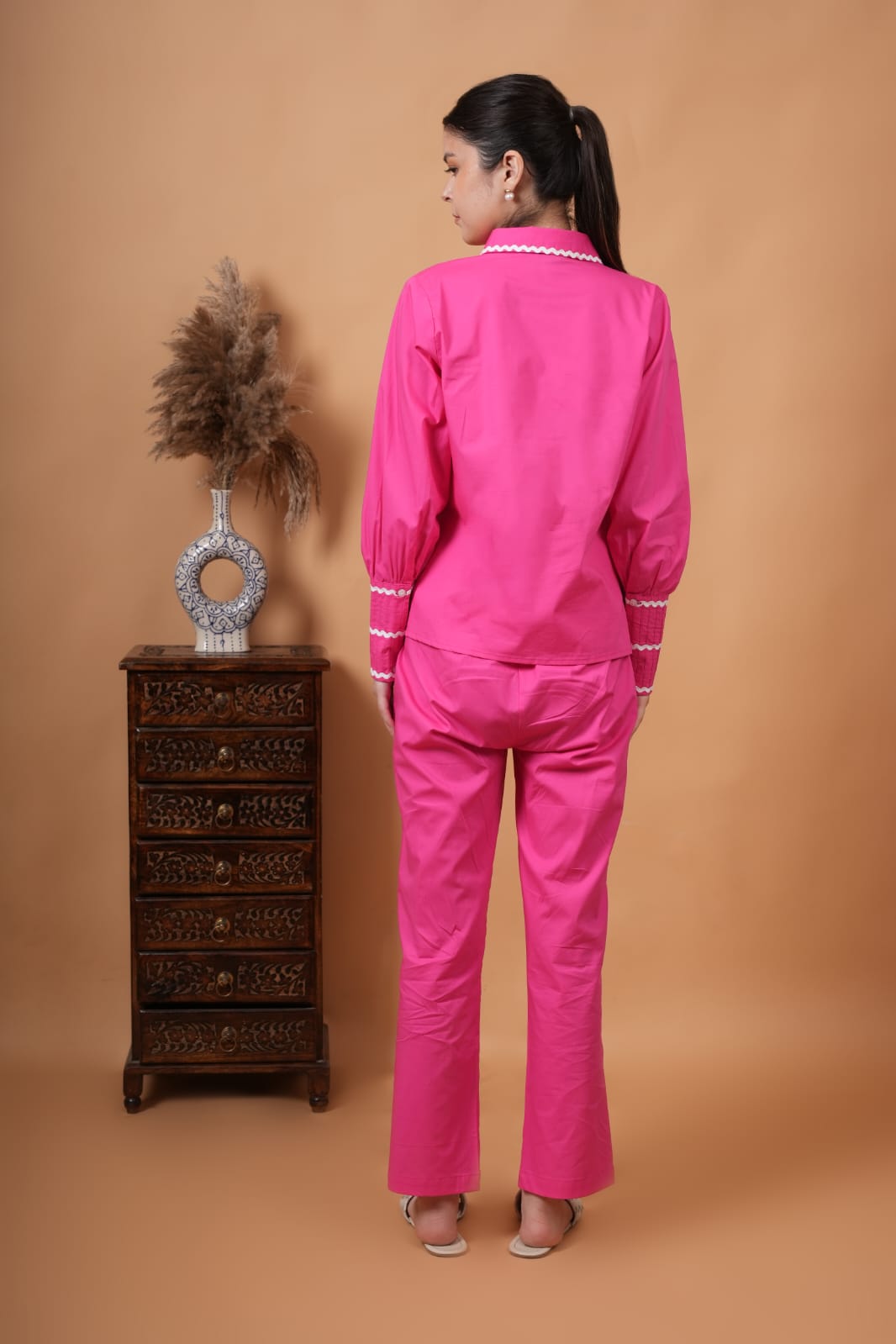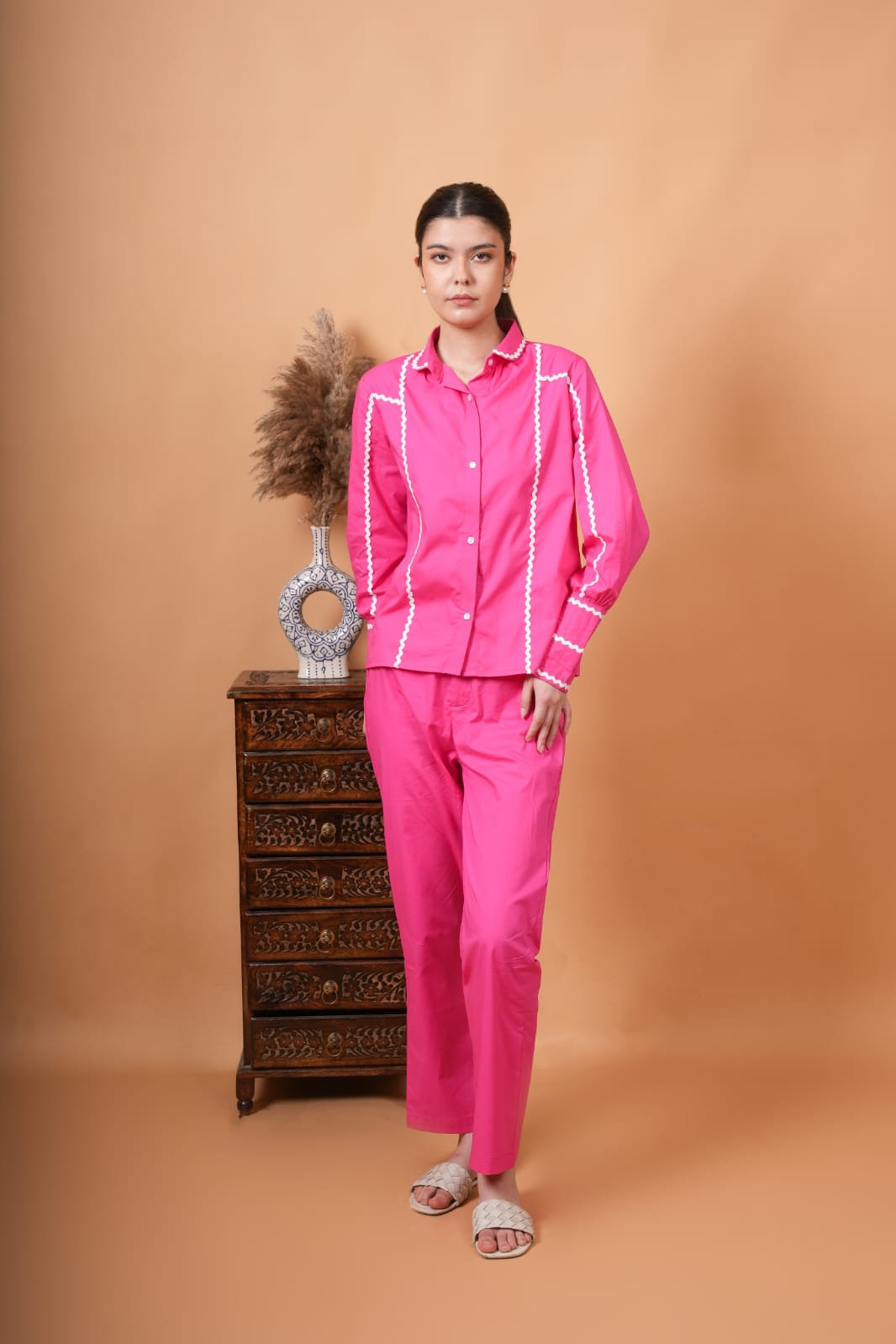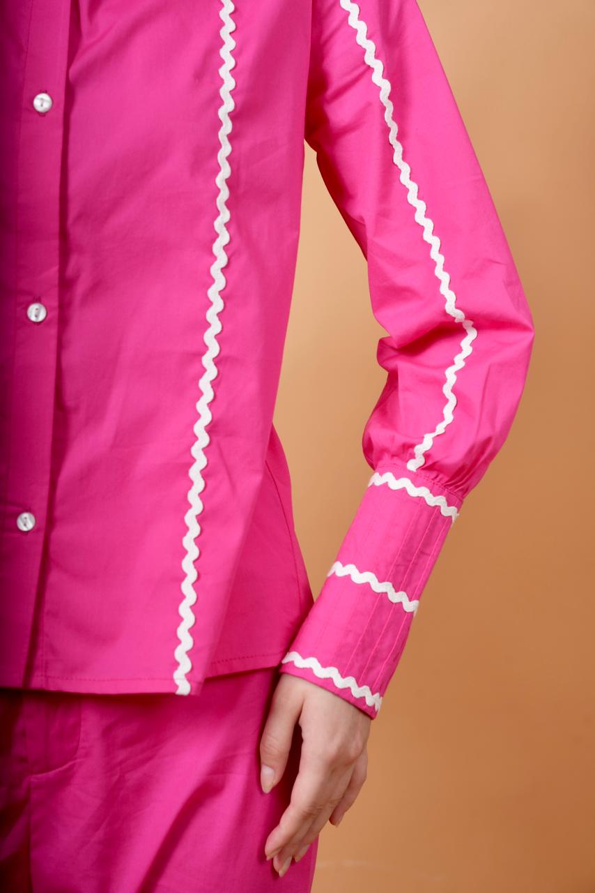 co ord set with a utton down shirt with peper pan collar and contrast lace along with pin tuck cuffs. paired with straight fit trouser