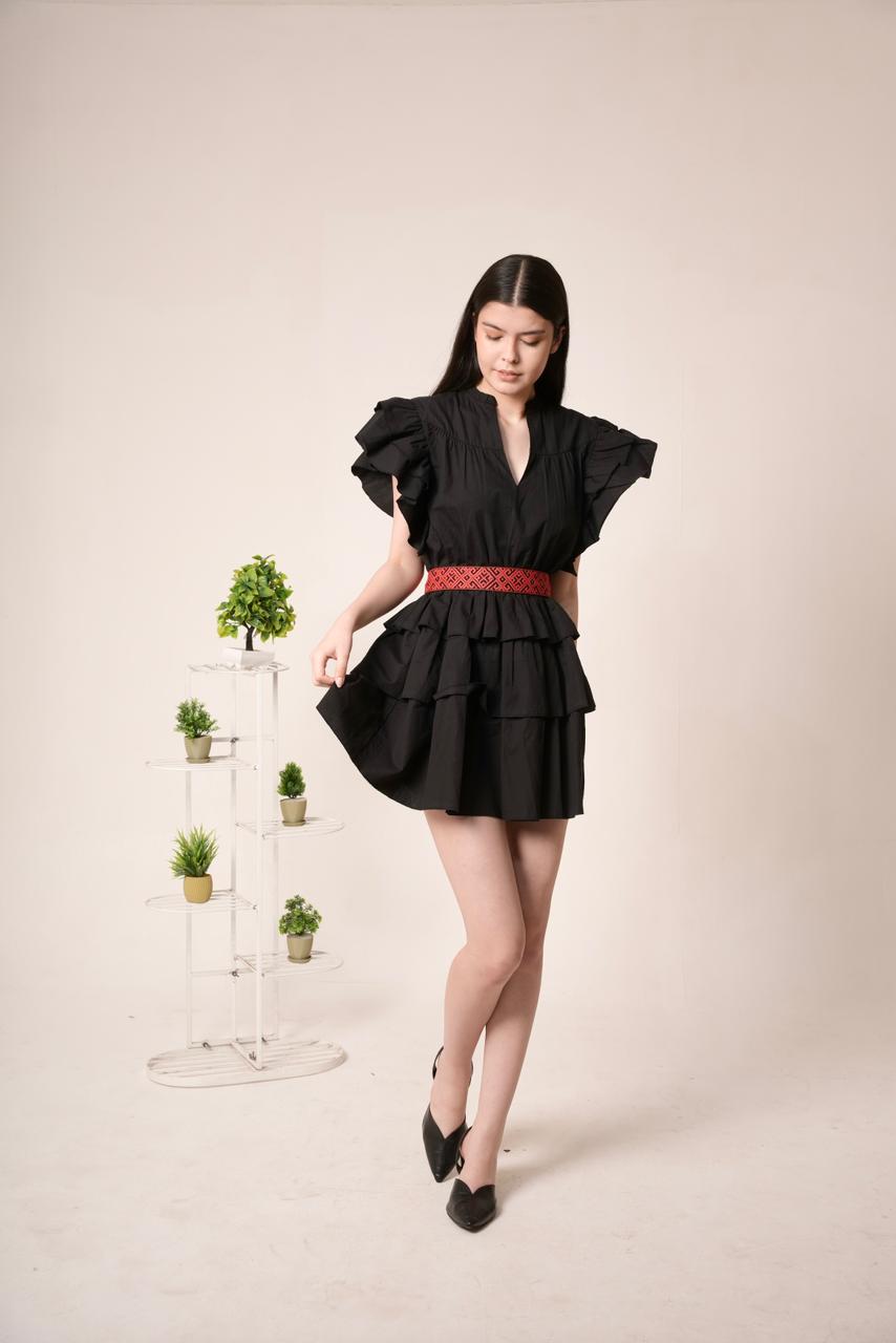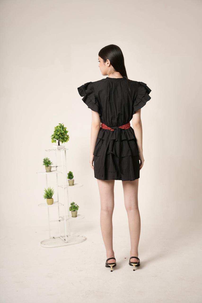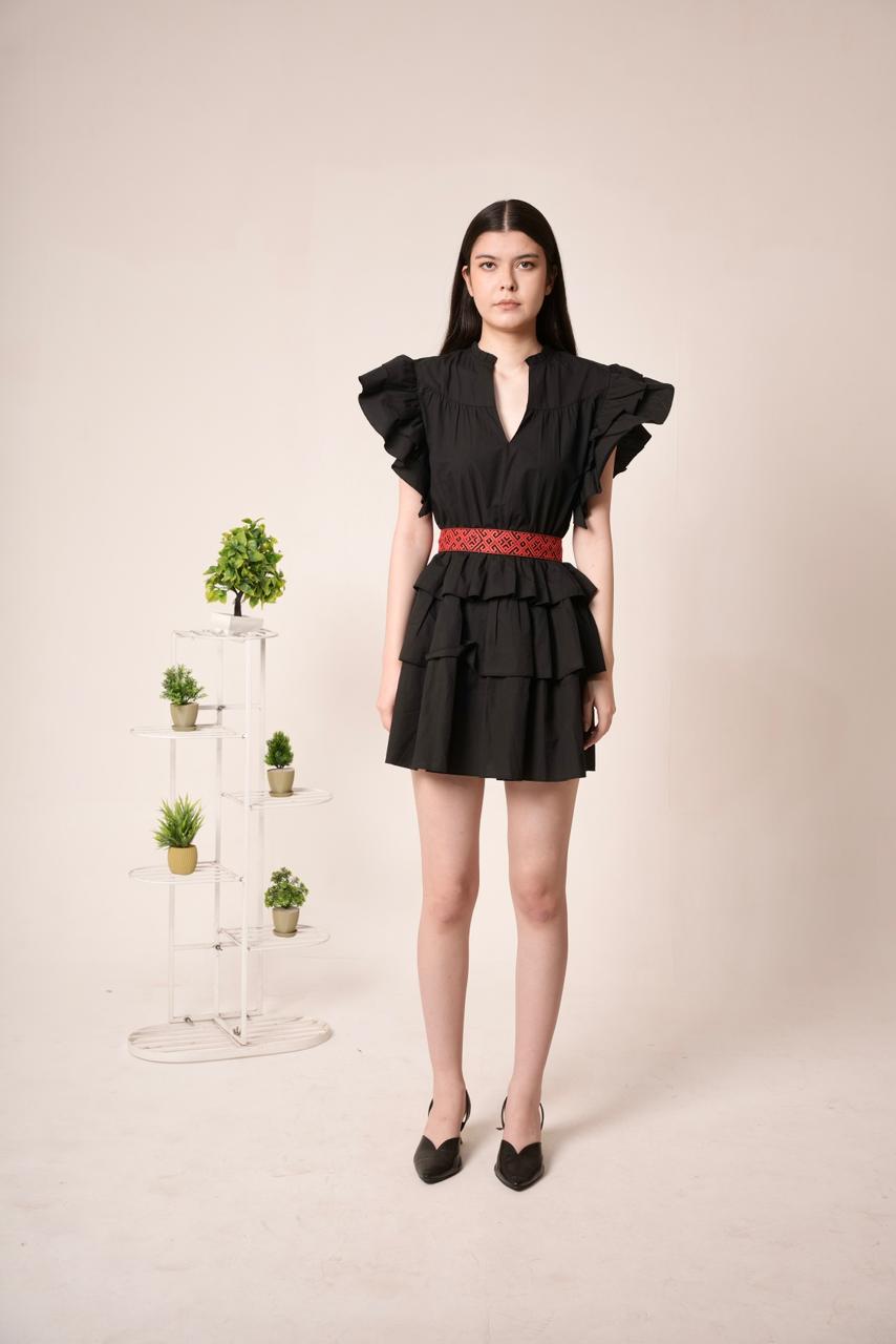 Black sleeveless mini dress featuring a tiered ruffle skirt, and striking red embroidery waistband that adds a pop of contrast and definition to the silhouette.