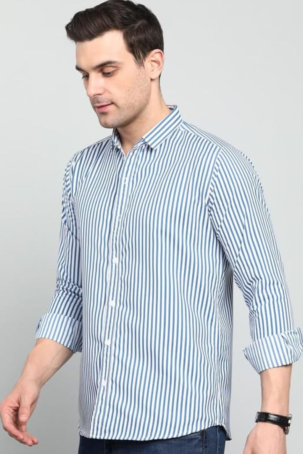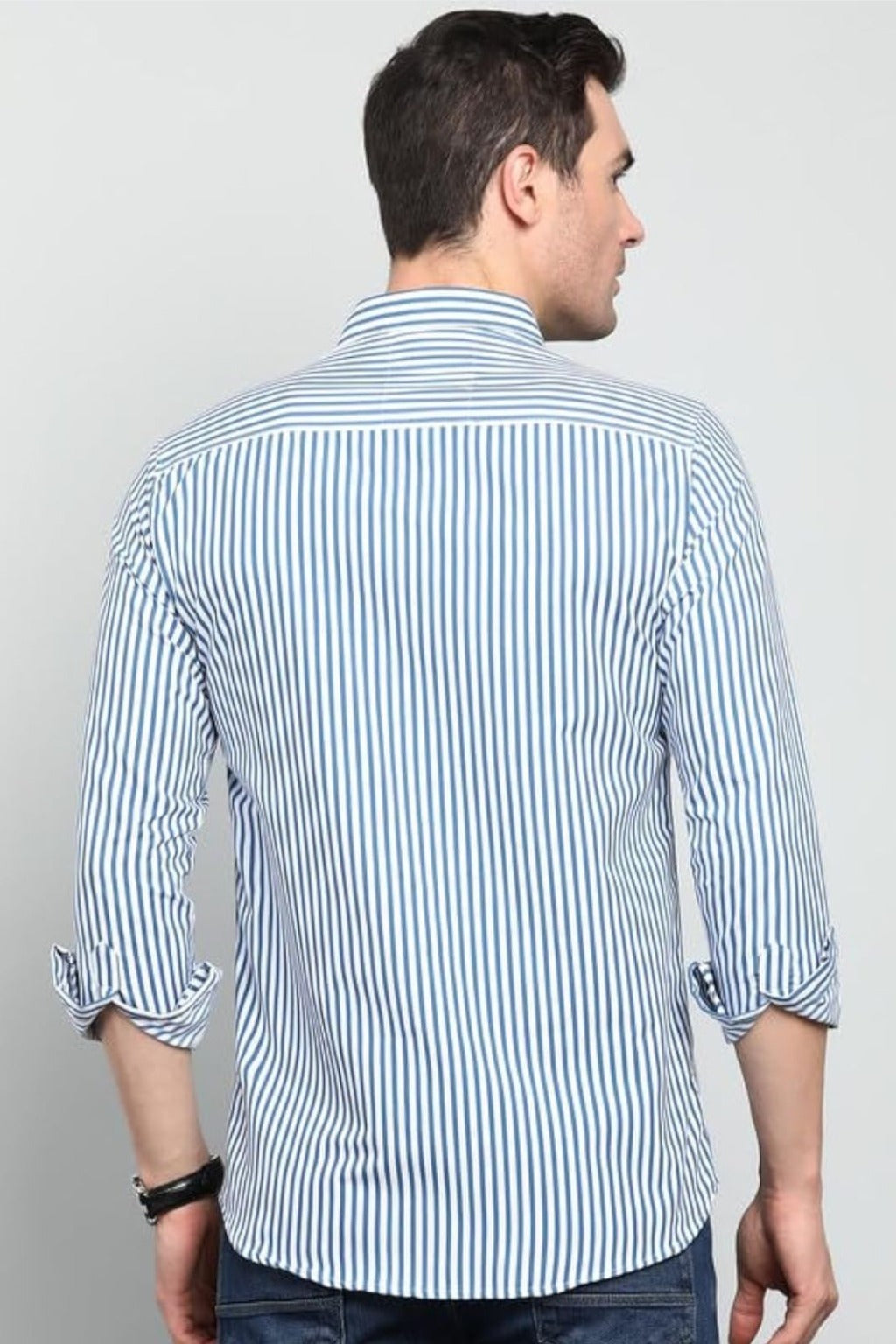 This yarn-dyed striped shirt features a soft cotton-blend fabric with long-lasting blue stripes woven into the material. Designed in a regular fit with long sleeves and a clean button-down front, it offers a crisp, versatile look perfect for work, outings, or everyday casual wear.