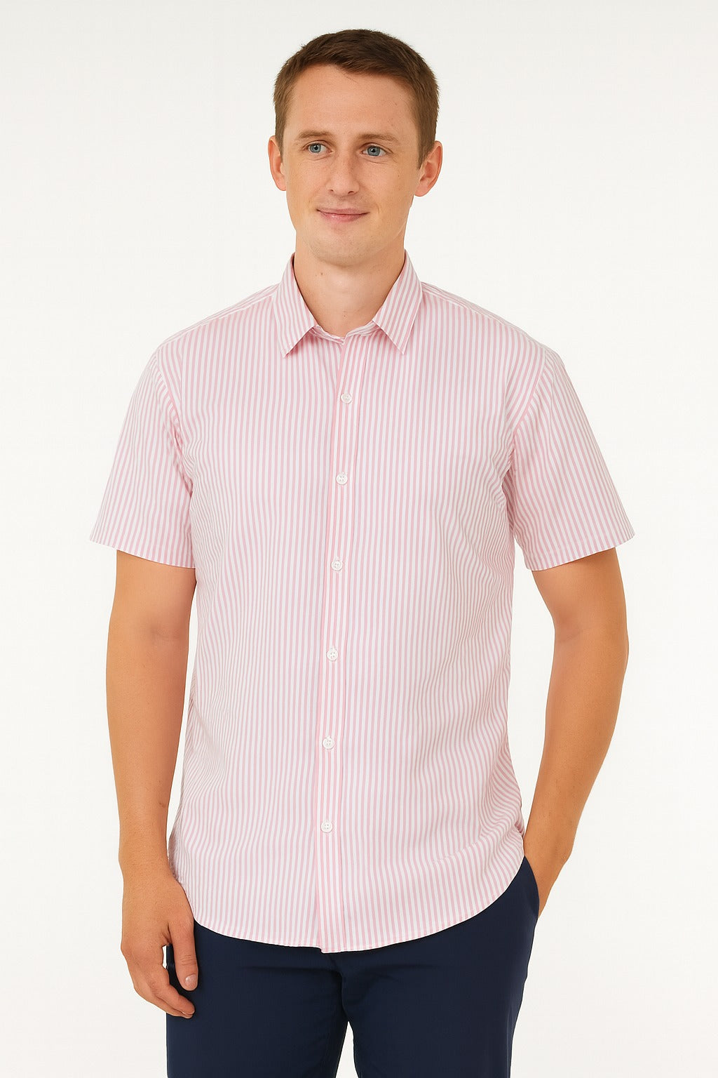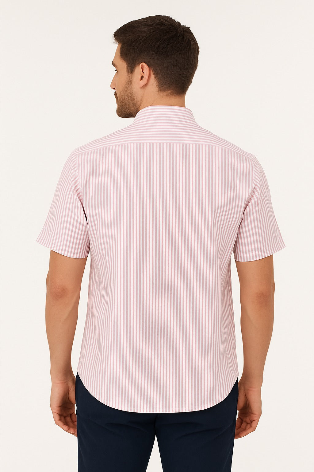 A light, breathable summer shirt crafted from premium yarn-dyed cotton featuring soft pink and white vertical stripes. The yarn-dye technique ensures long-lasting colour and a clean, crisp texture. Designed with a classic spread collar, short sleeves, and a full button-down placket, this shirt offers an easygoing yet polished look. Ideal for casual outings, office Fridays, vacations, and everyday comfort in warm weather.