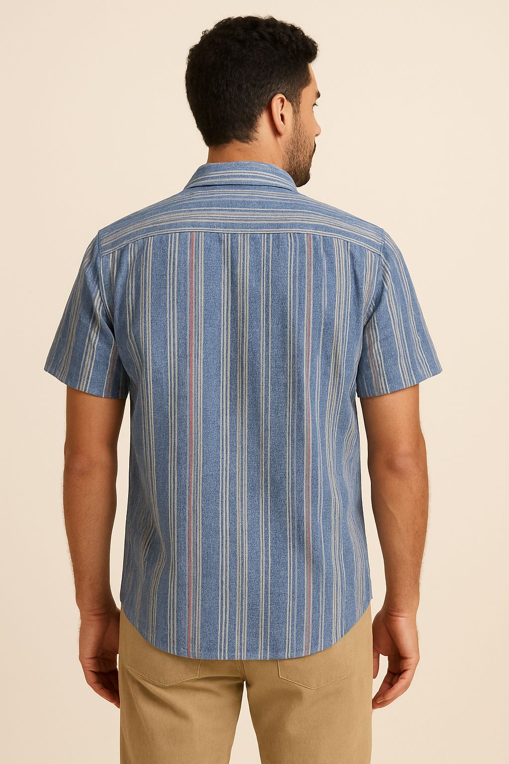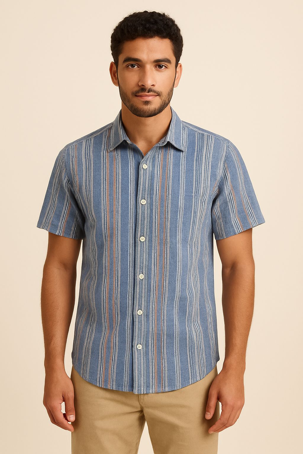 This men’s yarn-dyed striped shirt is crafted from premium 100% cotton fabric, offering both comfort and breathability for all-day wear. The vertical multi-coloured stripes add a refined and stylish appeal, making it perfect for casual outings, vacations, or relaxed weekend looks.