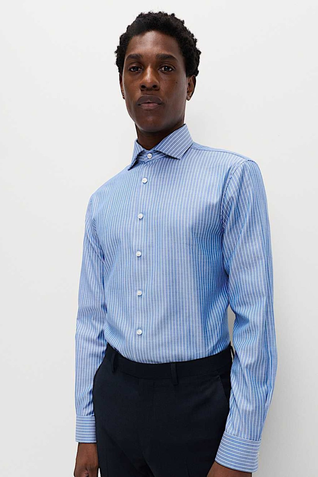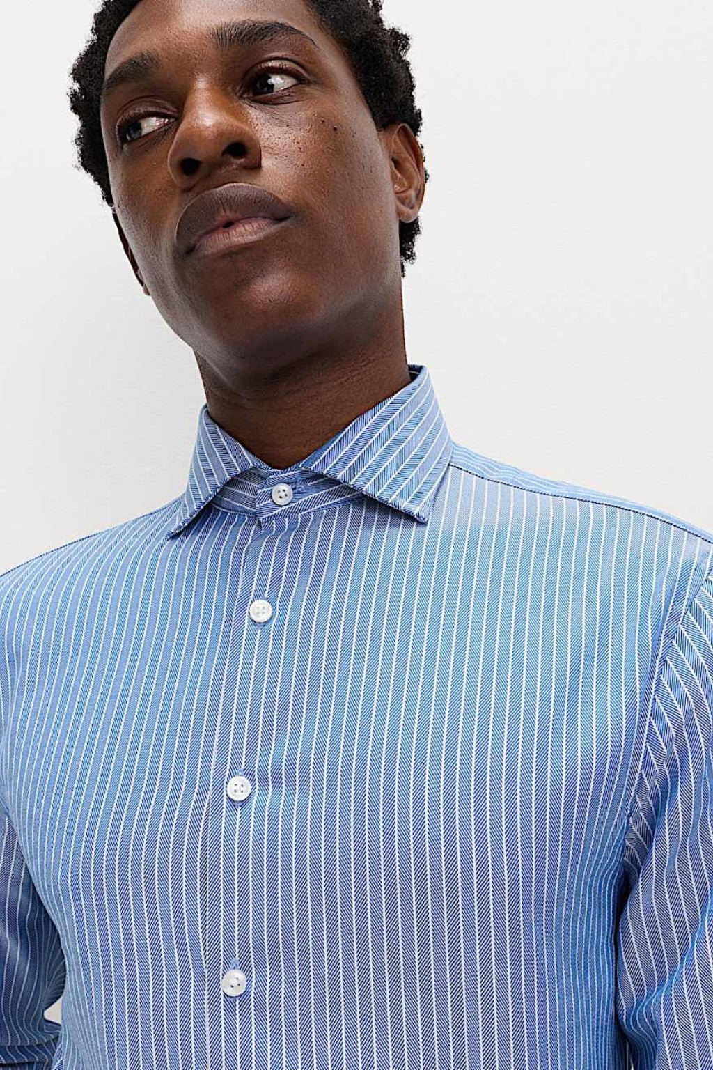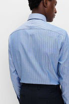 This yarn-dyed blue striped formal shirt is crafted from a premium cotton-blend fabric, offering a smooth feel and long-lasting colour. Designed in a slim, tailored fit with a classic collar and long sleeves, it delivers a sharp and clean look ideal for office wear, meetings, or polished everyday style.