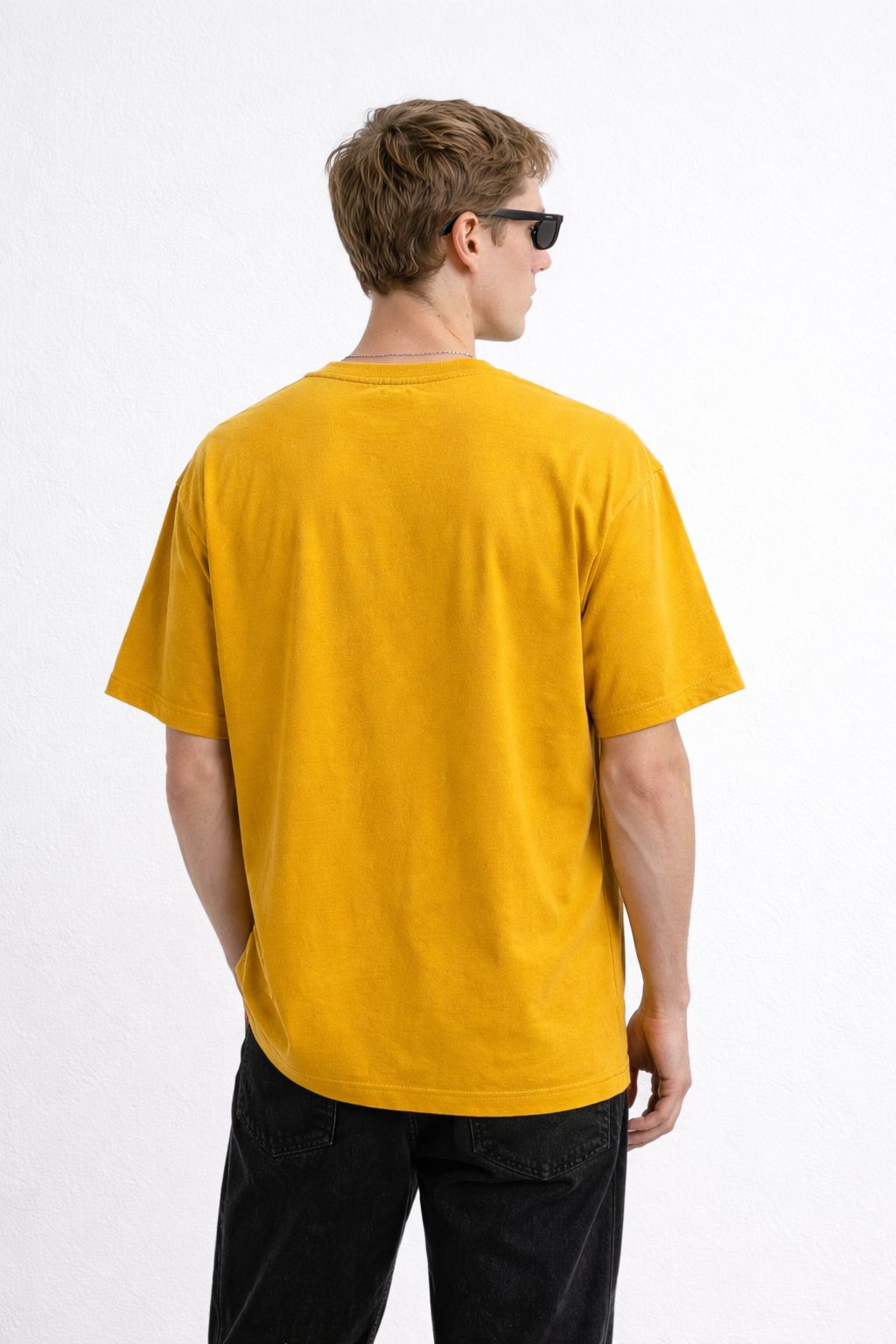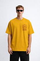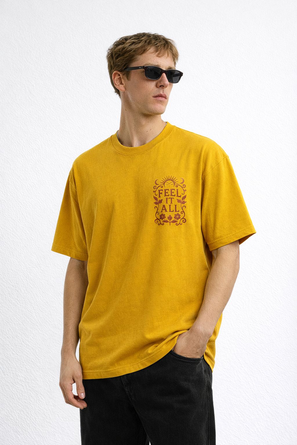 Subtle mustard tee with front chest print 'Feel The Bliss' in soft floral vintage font.