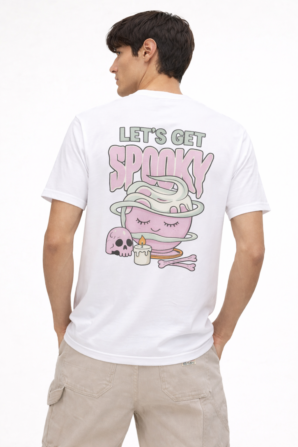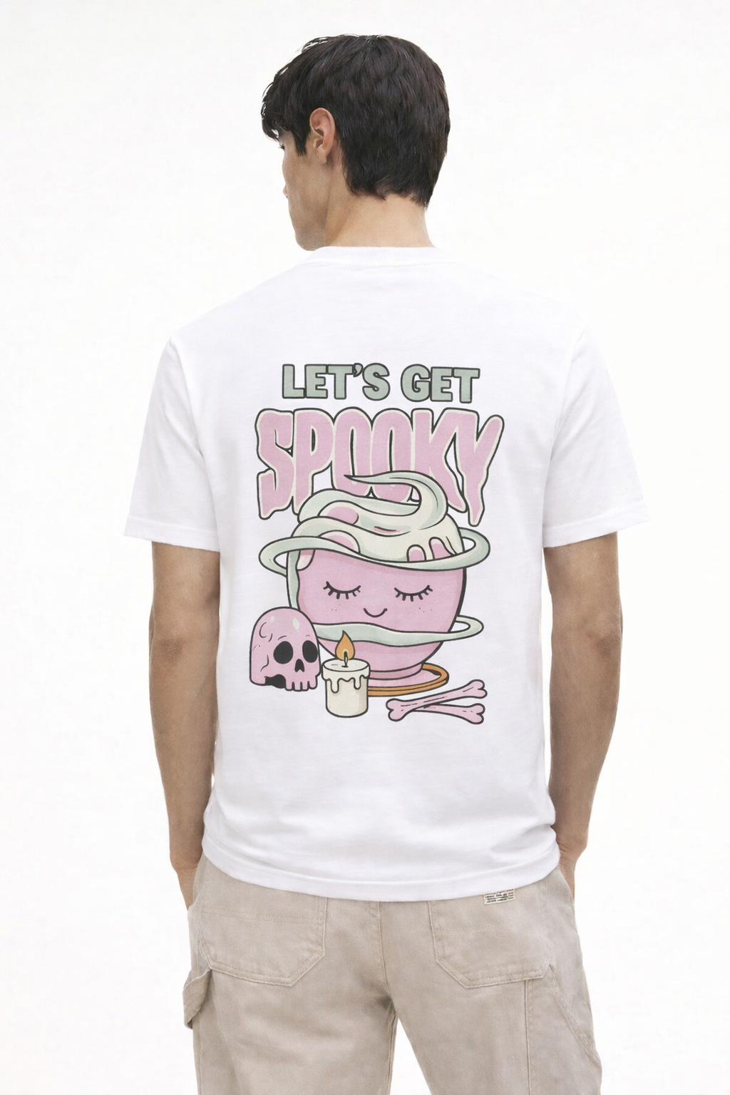 Halloween-themed tee with cauldron, skull, and bones illustration with bold 'Let’s Get Spooky' text.