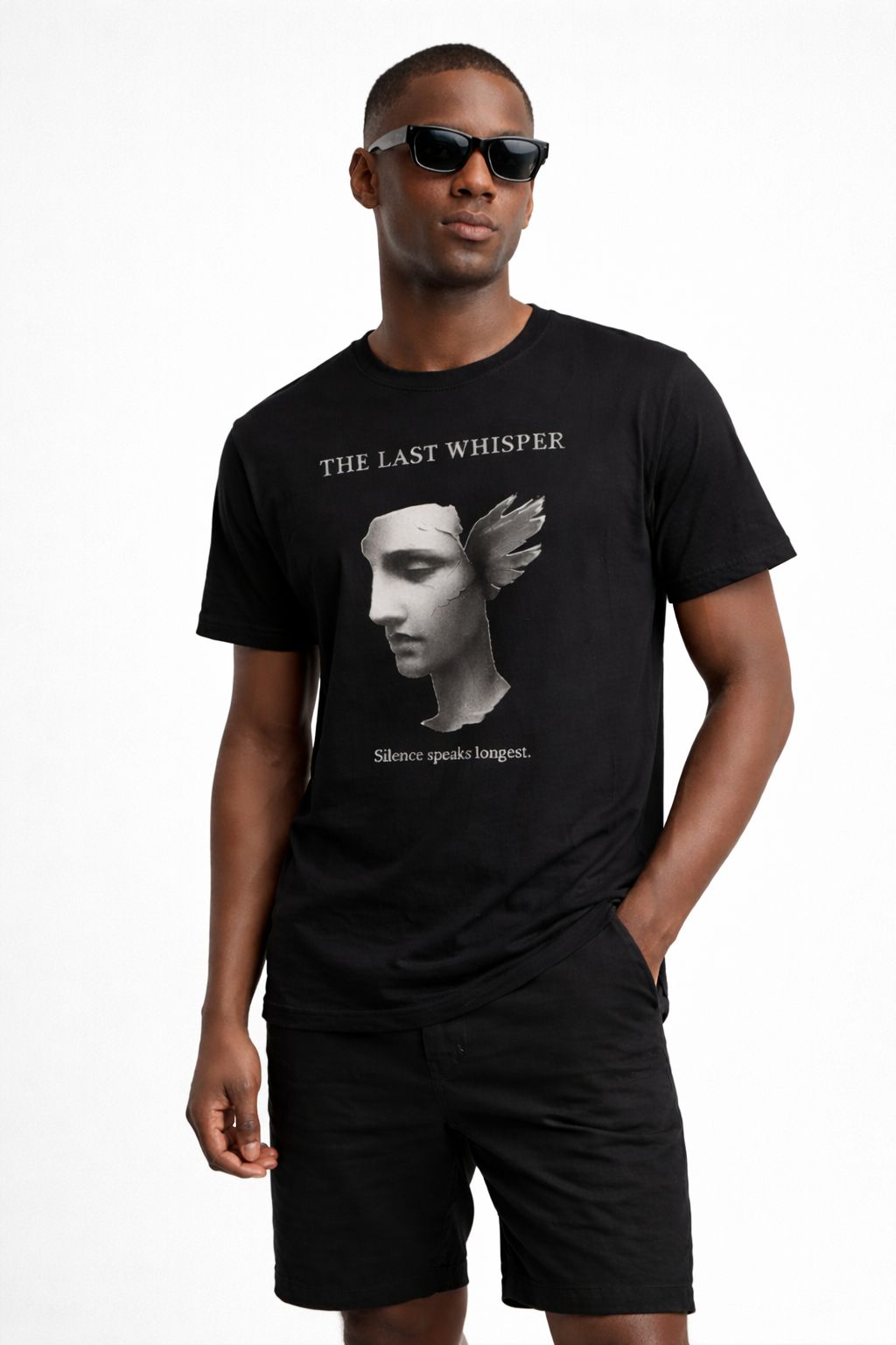 Classic gothic art tee with a sculpture head and 'Silence speaks tongues' typography.