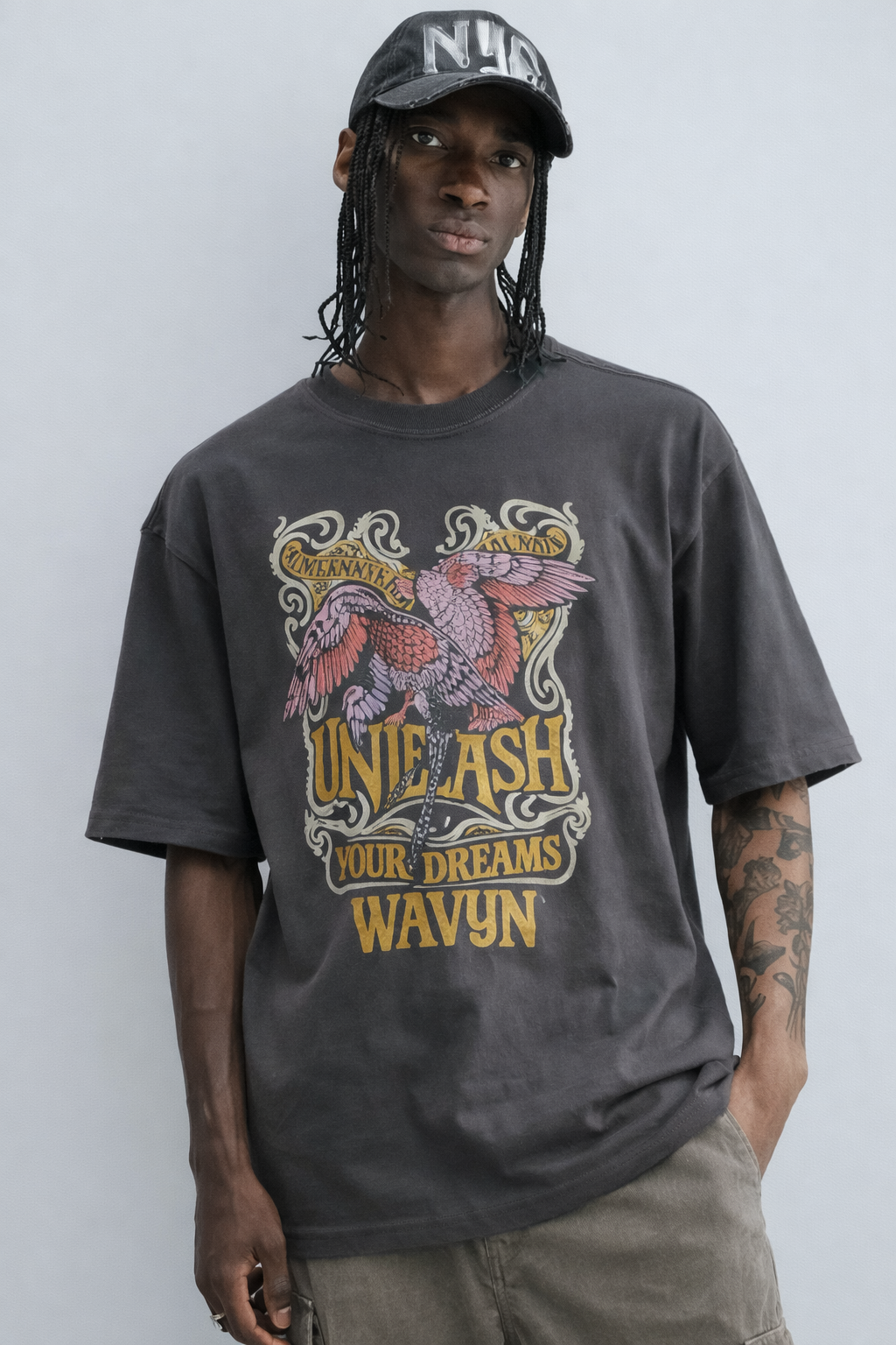 Bold motivational tee with colorful bird and vibrant typography encouraging dream pursuit.
