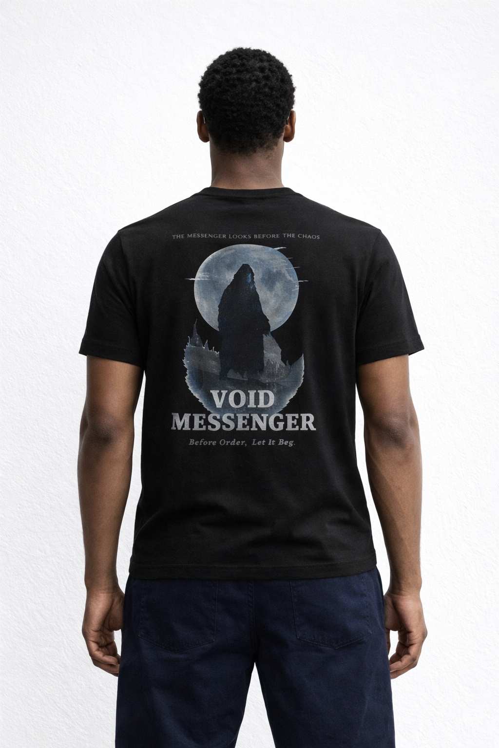 Dark-themed tee featuring a cloaked figure against a moon background with mystical vibes.