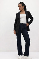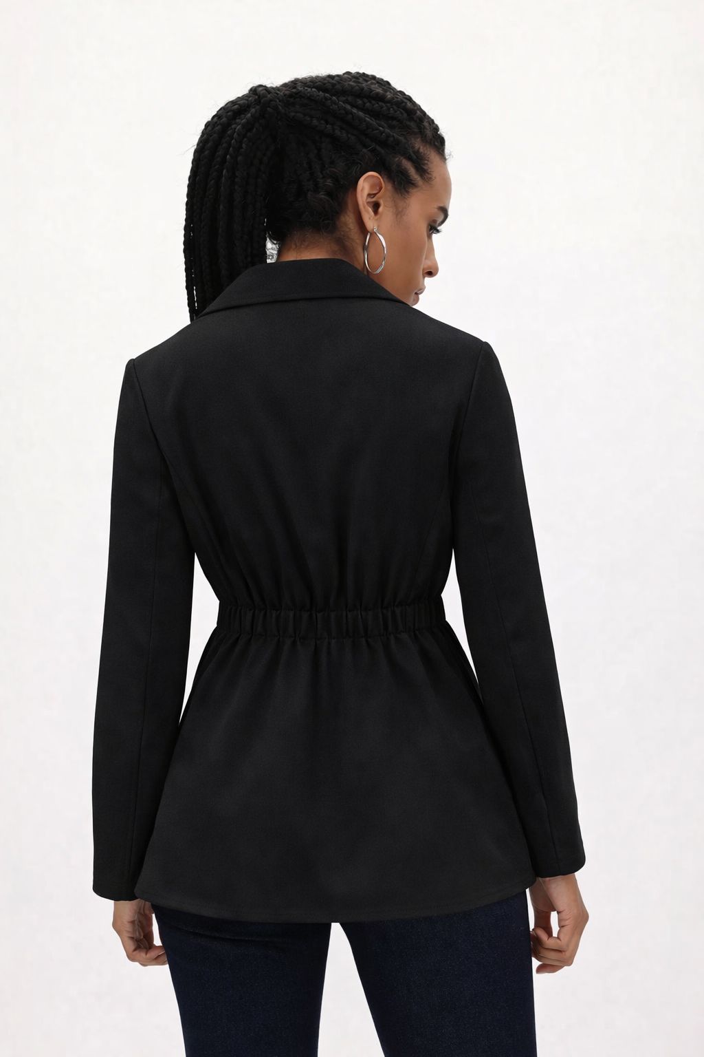 A tailored dark Black blazer with a structured silhouette and waist-defining fit, designed for a polished and modern look suitable for both work and smart-casual wear.Ideal for professional wear or smart-casual outfits—pairs well with trousers, skirts, or dresses for a refined, modern look.