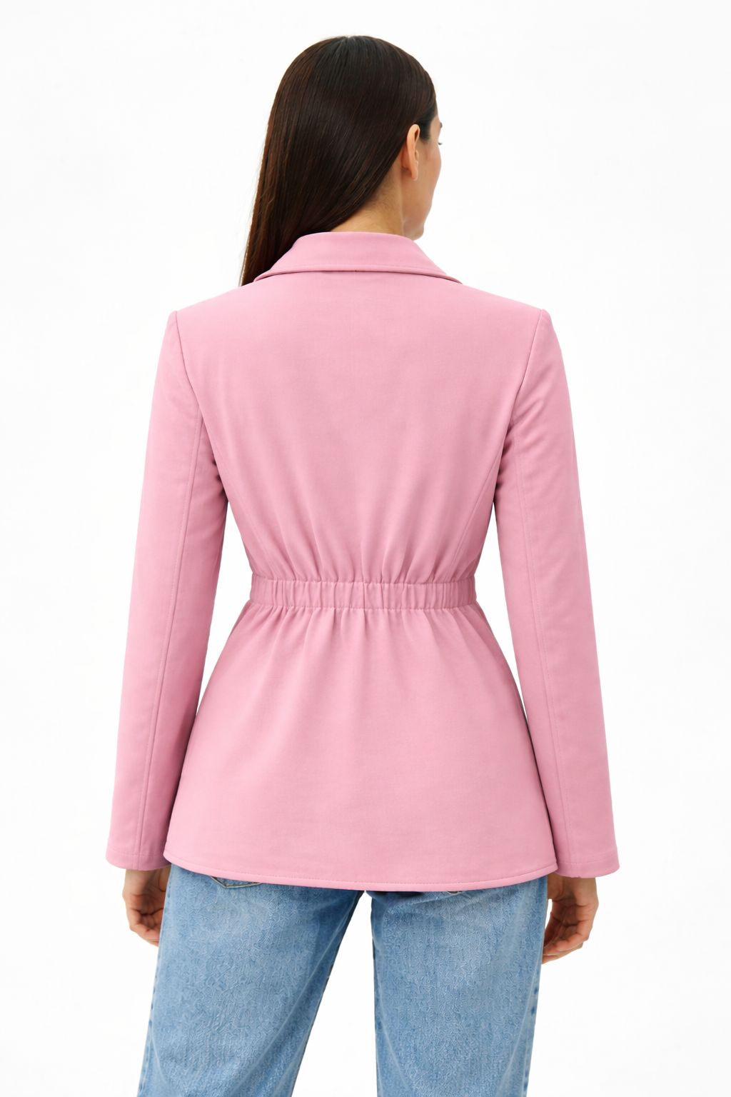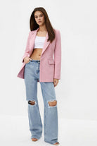 A tailored Pink blazer with a structured silhouette and waist-defining fit, designed for a polished and modern look suitable for both work and smart-casual wear.Ideal for professional wear or smart-casual outfits—pairs well with trousers, skirts, or dresses for a refined, modern look.