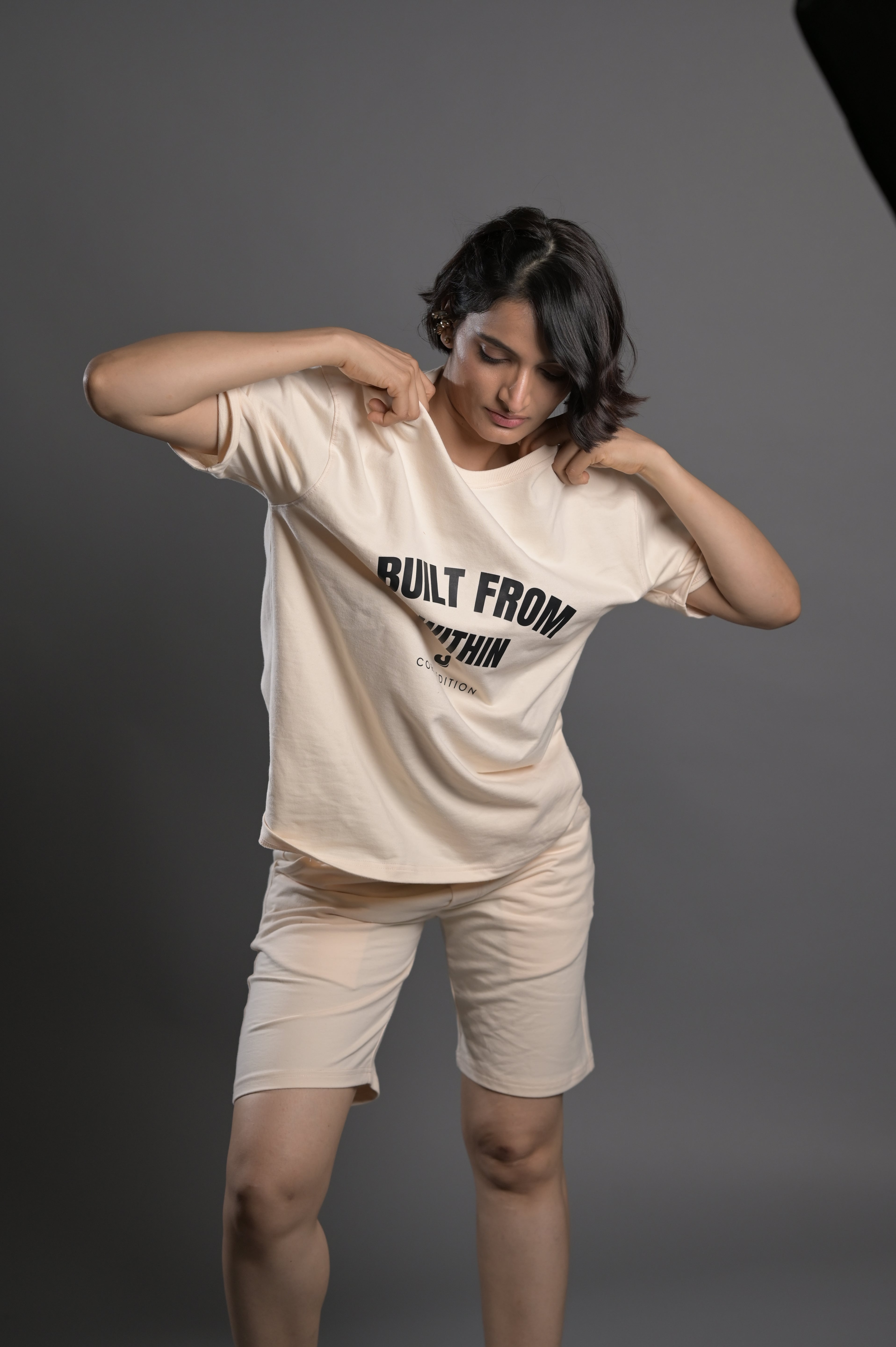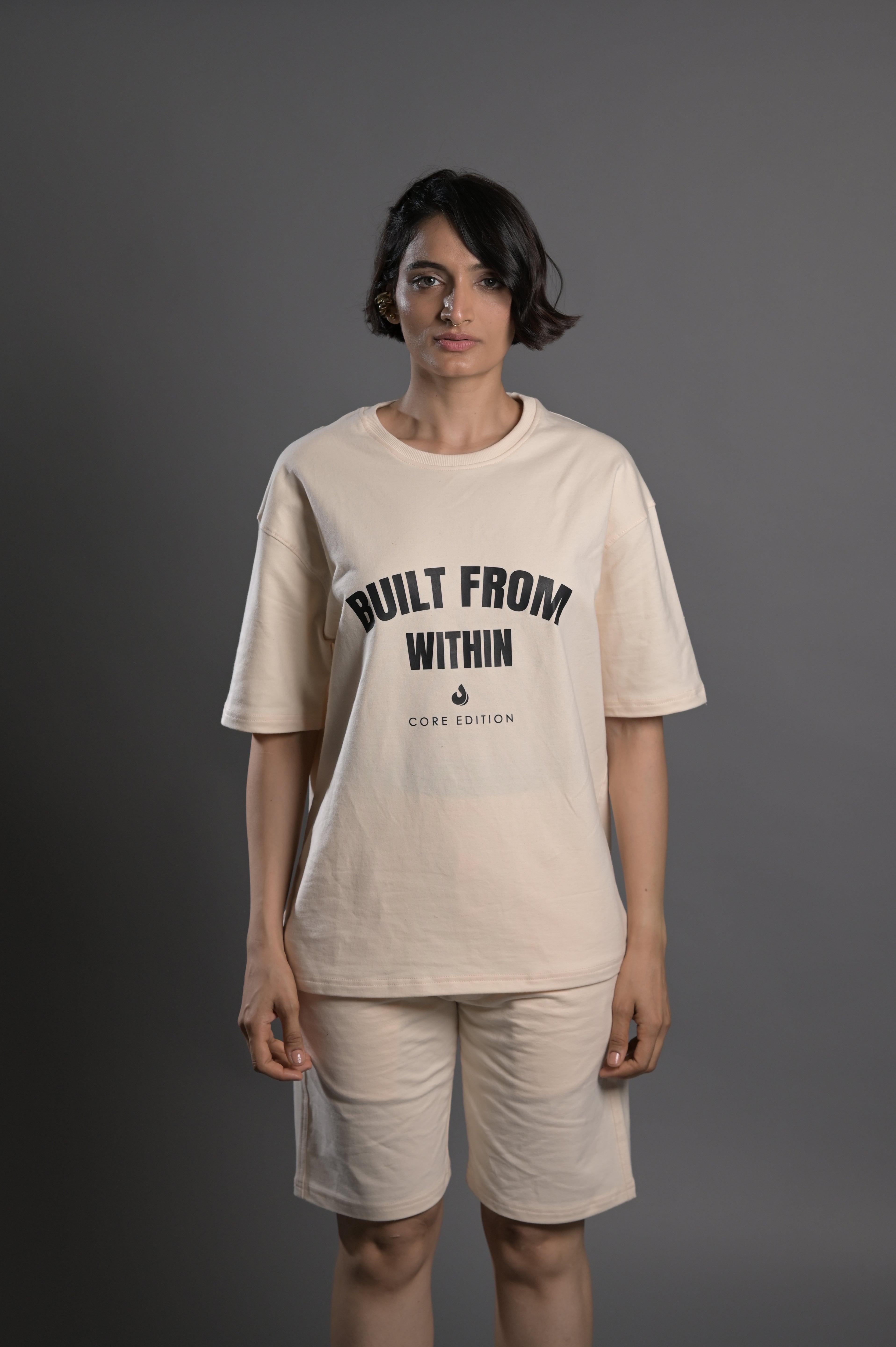 Elevate your casual wardrobe with this cream co-ord set featuring a bold front print tee that reads "BUILT FROM WITHIN." Made from premium cotton fabric, the set offers a relaxed fit with a drop-shoulder T-shirt and matching shorts, delivering both comfort and minimal street-style appeal. Perfect for everyday wear, workouts, or lounging.