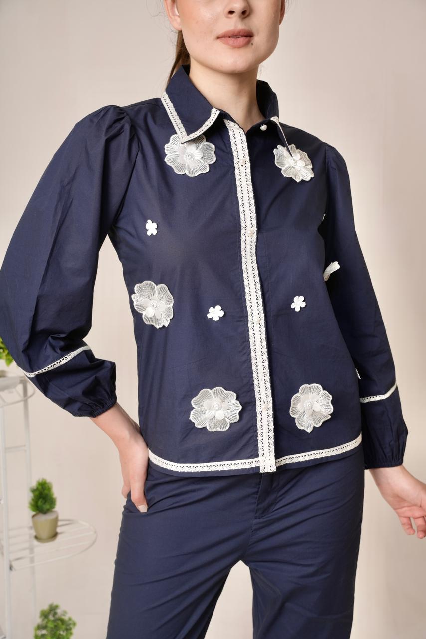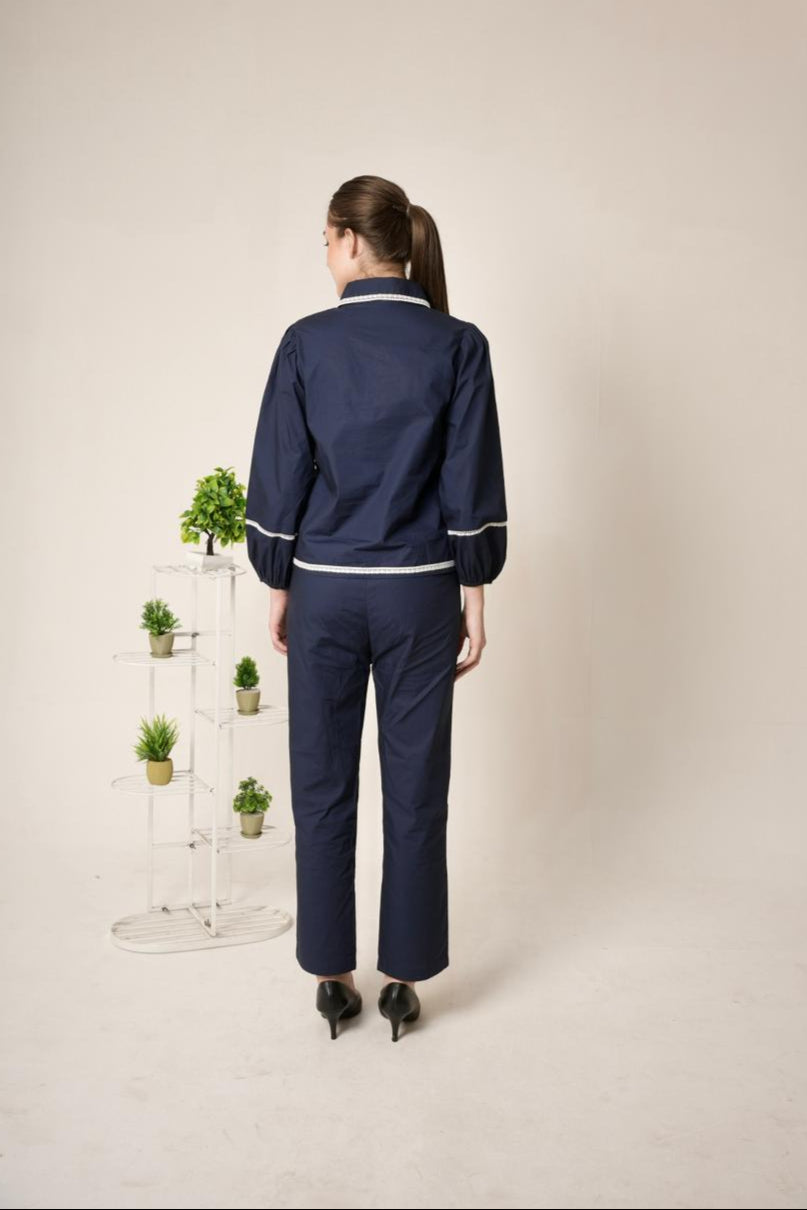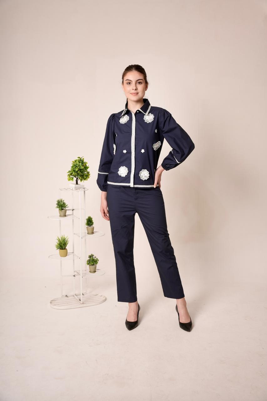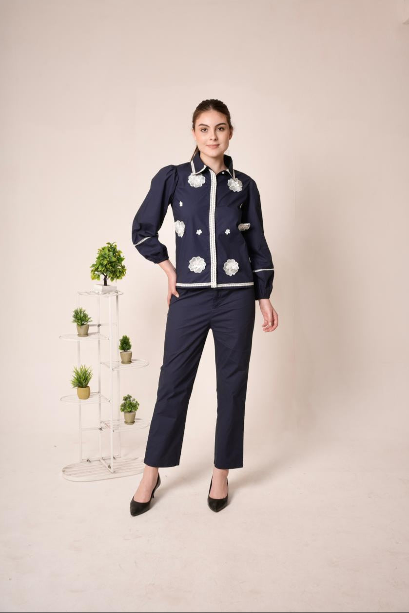 co ord set featuring a button down top with balloon sleeve. embellished with patch flowers. with contrast trim and buttons for statement look,with matching tailored trouser.