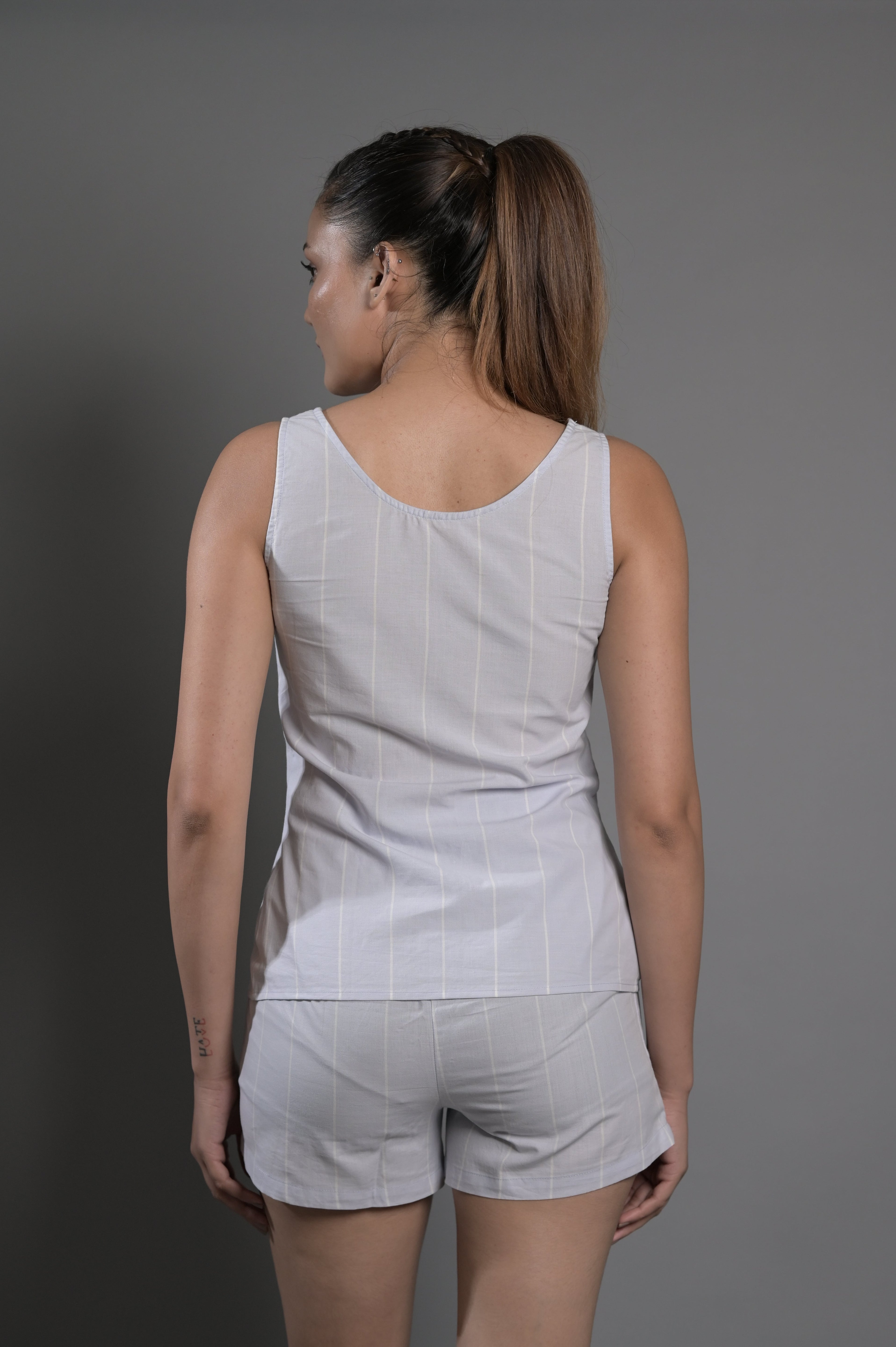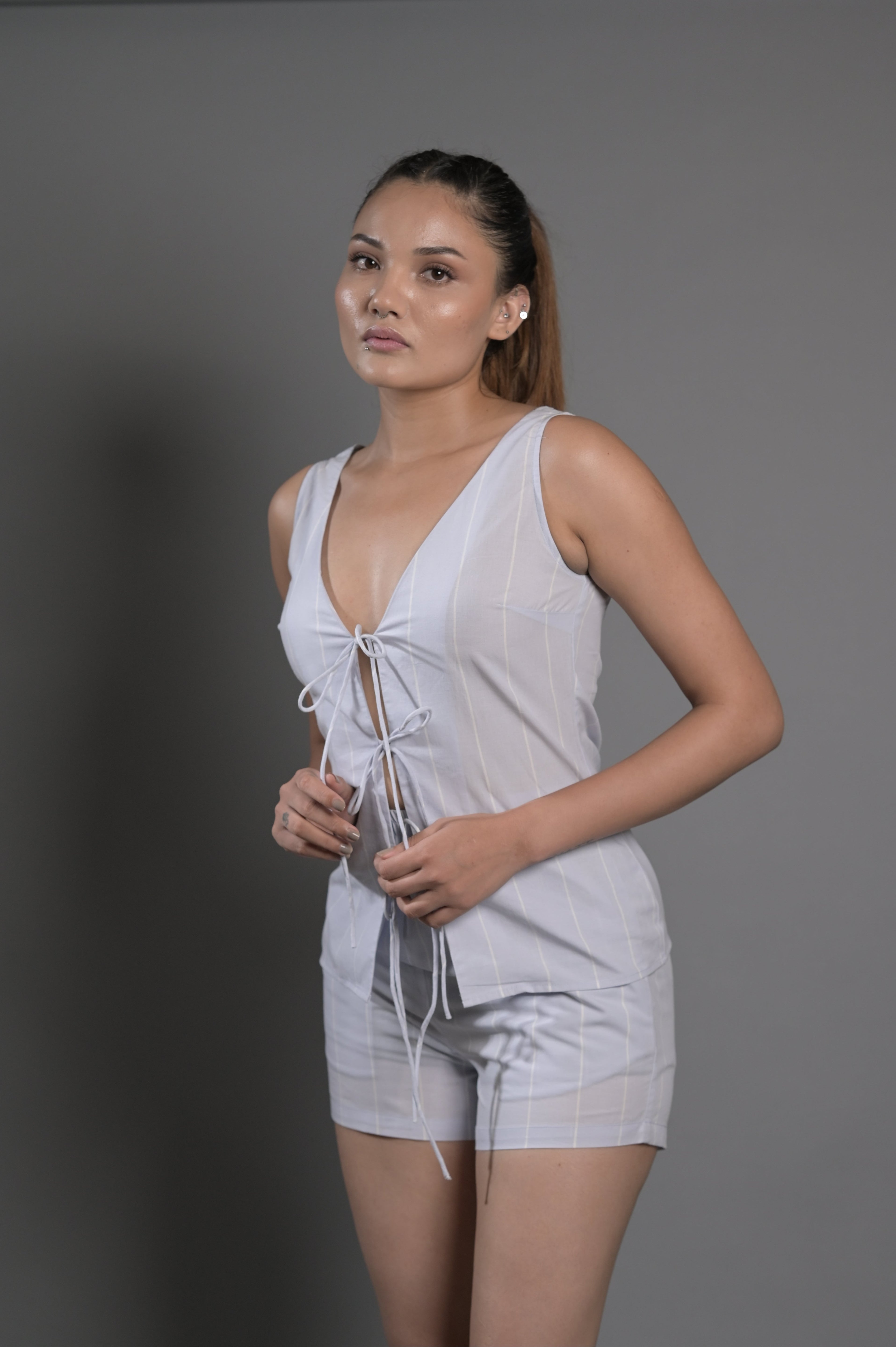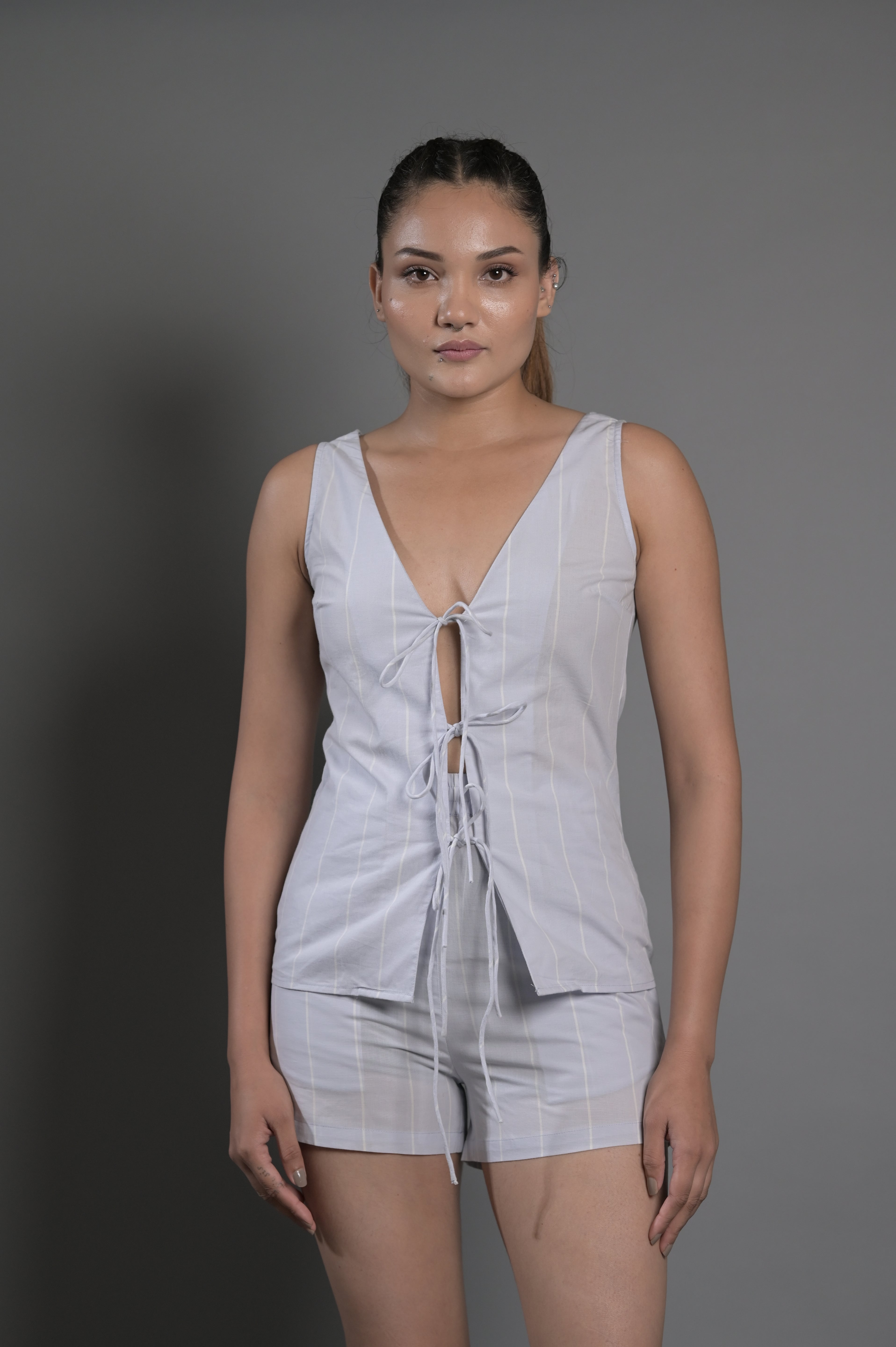 Sleeveless V-neck top with multiple front tie-ups paired with matching shorts.