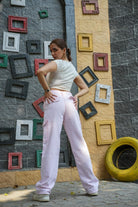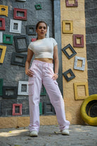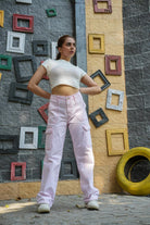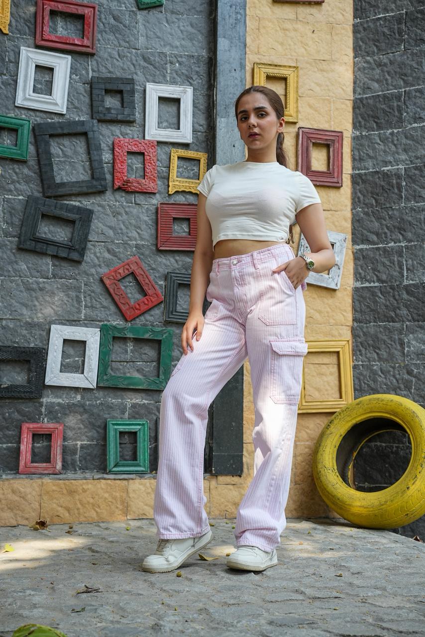 Light pink striped cargo jeans with multiple utility pockets and a relaxed straight fit. The playful color adds a fresh twist to classic cargo styling, styled effortlessly.