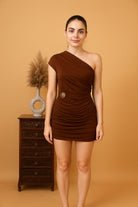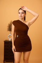 A chocolate brown one-shoulder ruched dress designed in soft stretch jersey for a bold and sculpted look.