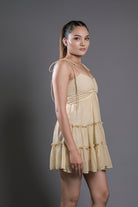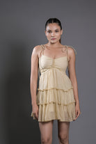 A romantic beige mini dress with delicate tie straps, ruched bust detailing, and layered ruffle tiers for a playful yet feminine look. Light and airy for warm-weather outings.