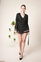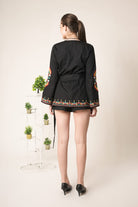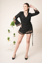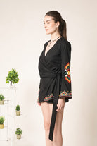 Black wrap style dres with a tie waist and multi color geometric ethnic inspired embroidery. the vibrant motifs in red, green, white, yellow add a bold artisanal touch to the modern silhouette.