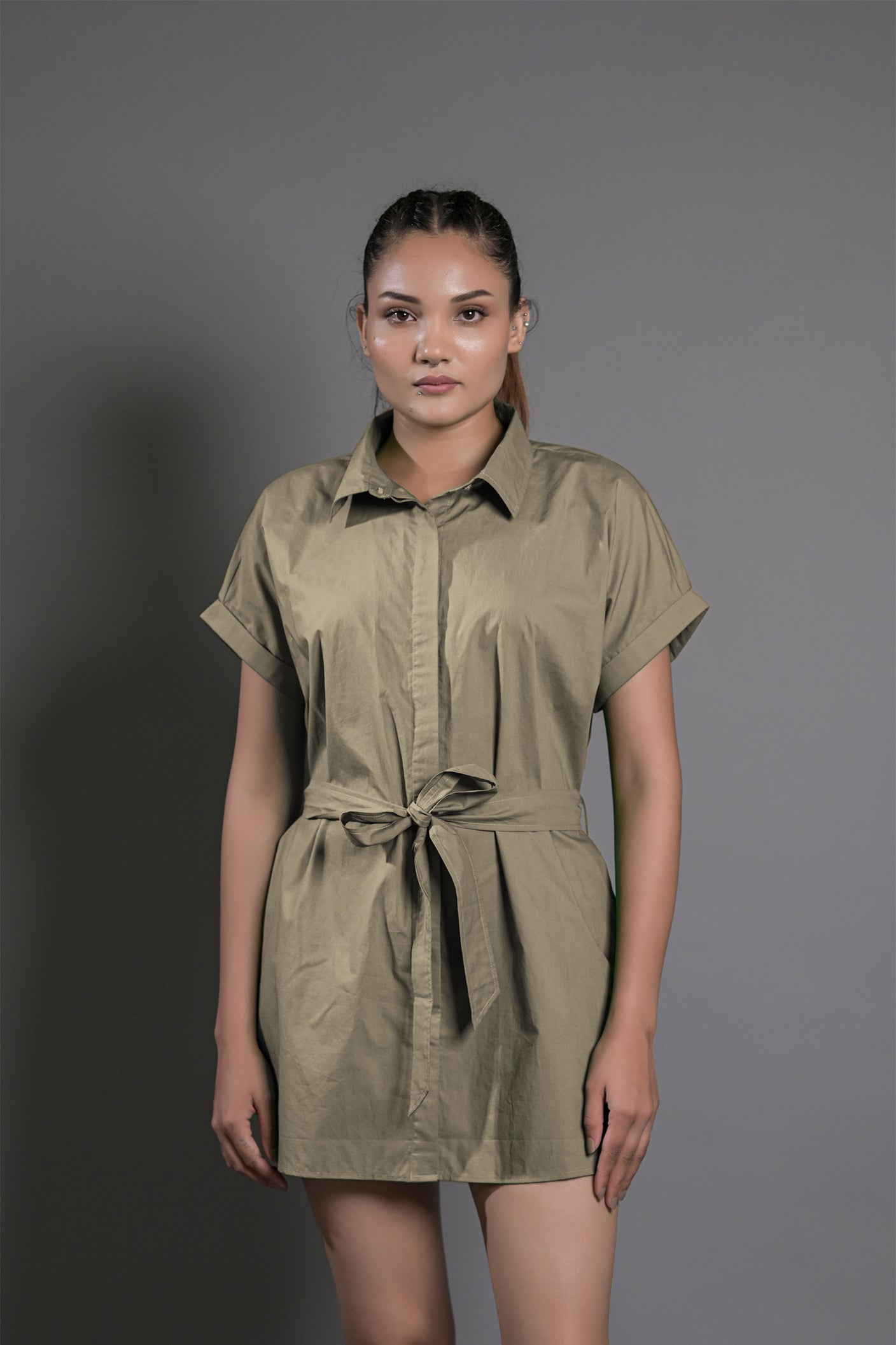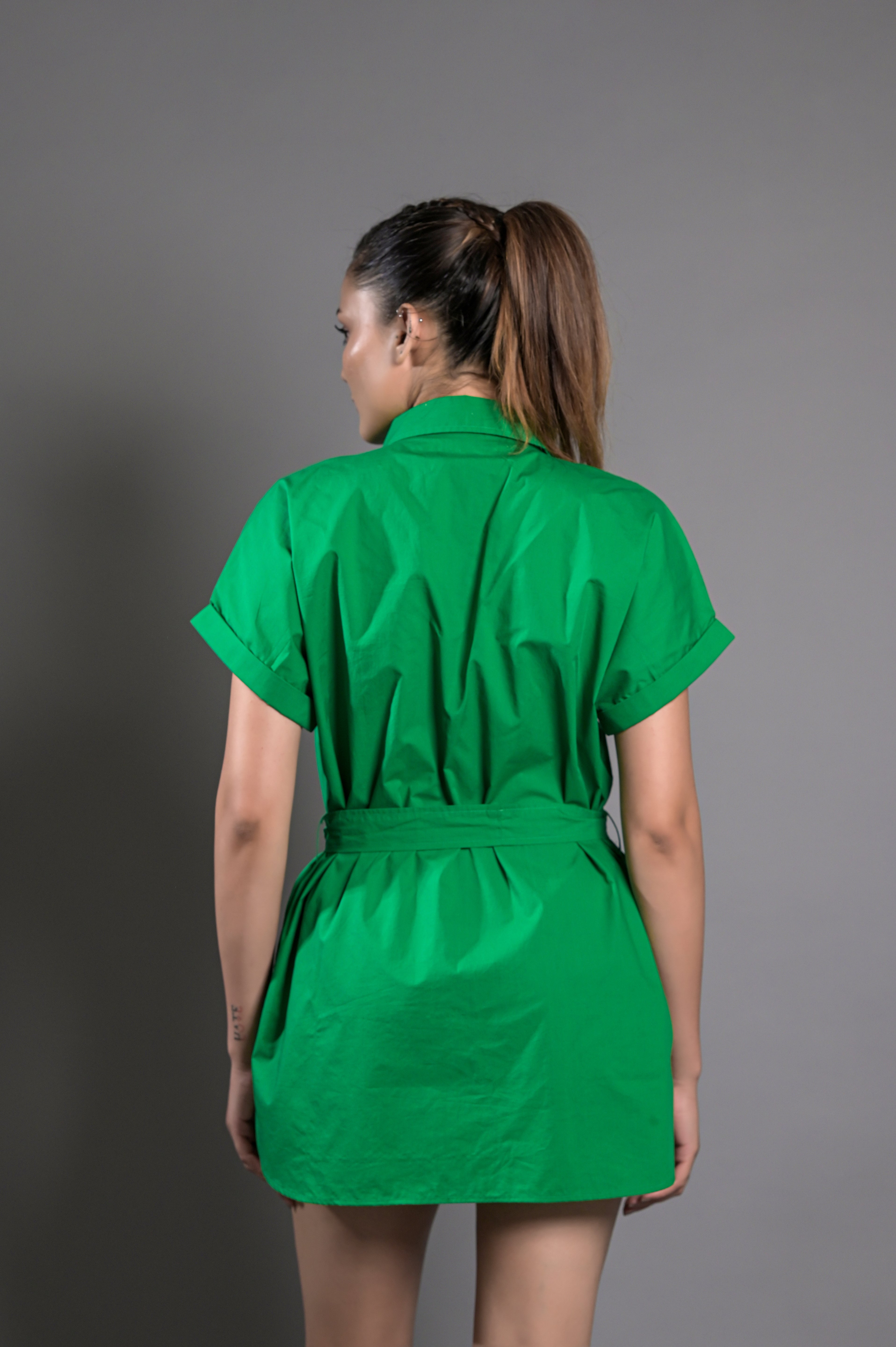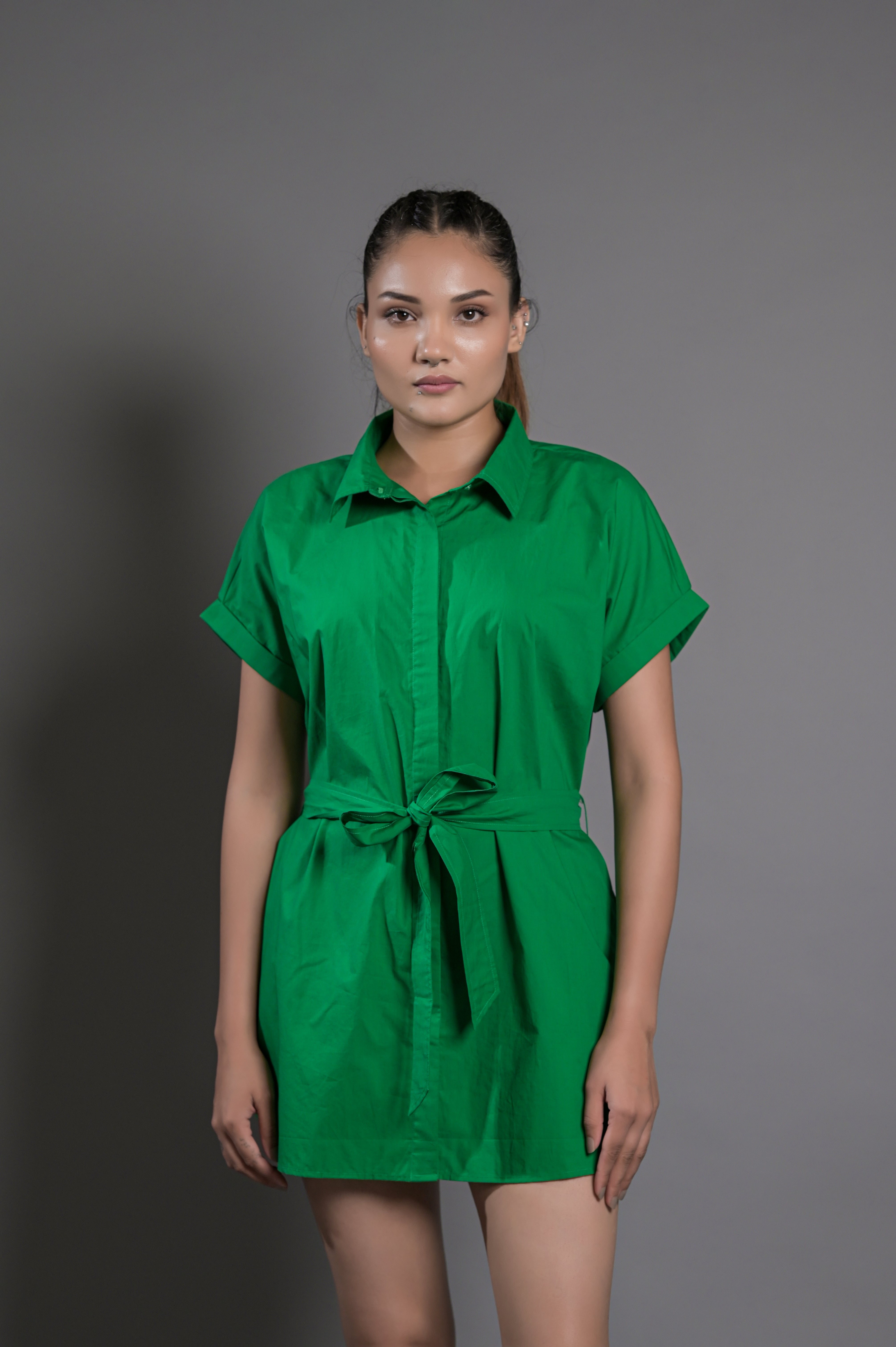 Minimalist green shirt dress with waist tie belt. Buttoned front and collar for a smart casual look.