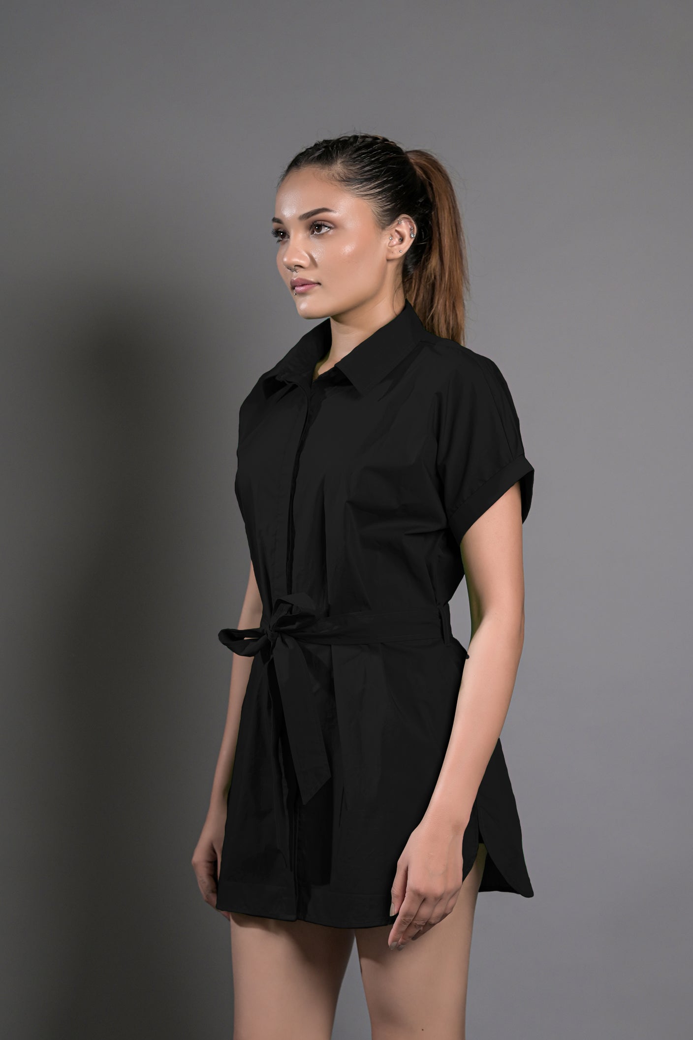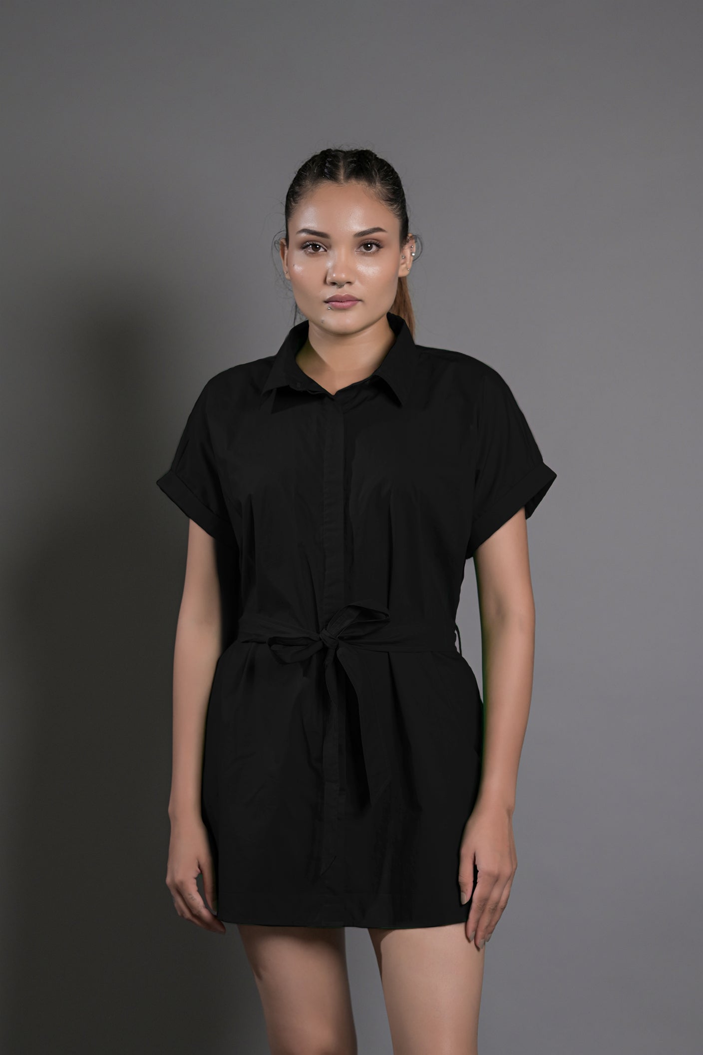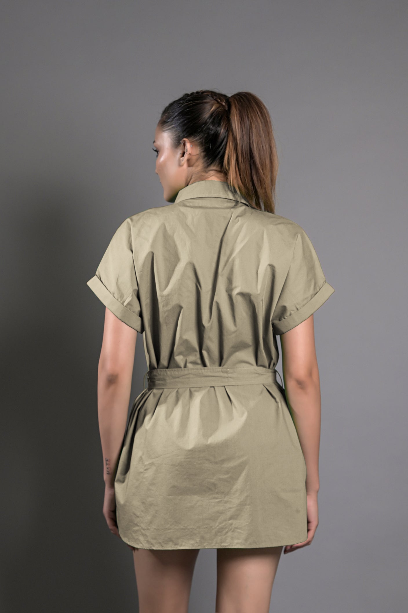 Minimalist green shirt dress with waist tie belt. Buttoned front and collar for a smart casual look.