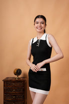 This sleeveless knit dress blends preppy style with modern chic, featuring a collared neckline, button placket, and textured diamond knit design. Contrast pocket accents and trims elevate its detail, while the slim fit enhances the silhouette. Ideal for brunch, casual outings, or day events when styled with flats or heels.