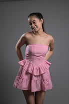 Chic strapless mini dress with layered ruffles and classic gingham print. Perfect for brunch or summer outings.