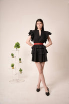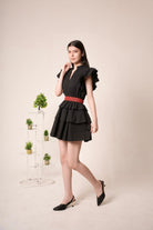 Black sleeveless mini dress featuring a tiered ruffle skirt, and striking red embroidery waistband that adds a pop of contrast and definition to the silhouette.