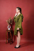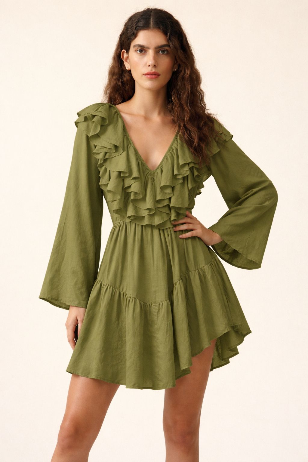 A Olive green mini dress featuring a plunging neckline with dramatic ruffle detailing, long flared sleeve and a flowy gathered skirt. the lightweight fabric and bold silhouette make it a standout statment piece