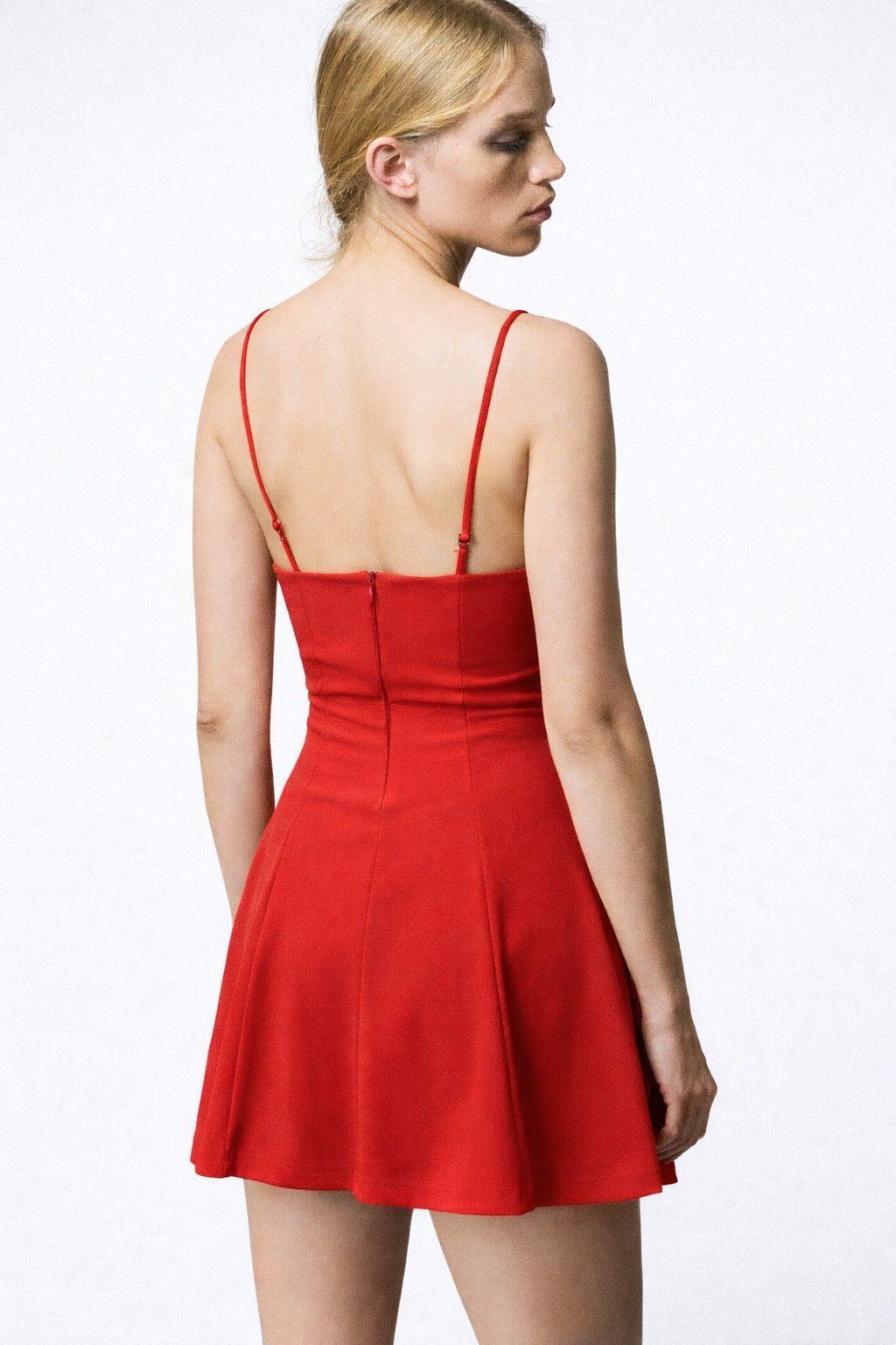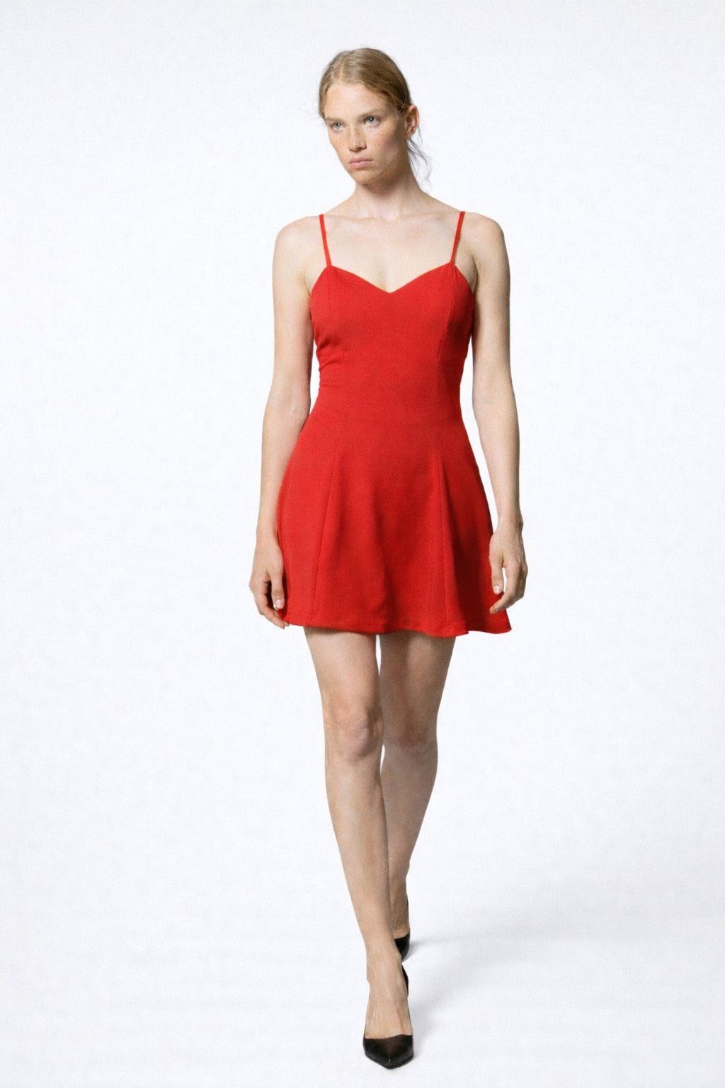 A bold red mini dress featuring a sweetheart neckline and flared hem. Ideal for parties or date nights.