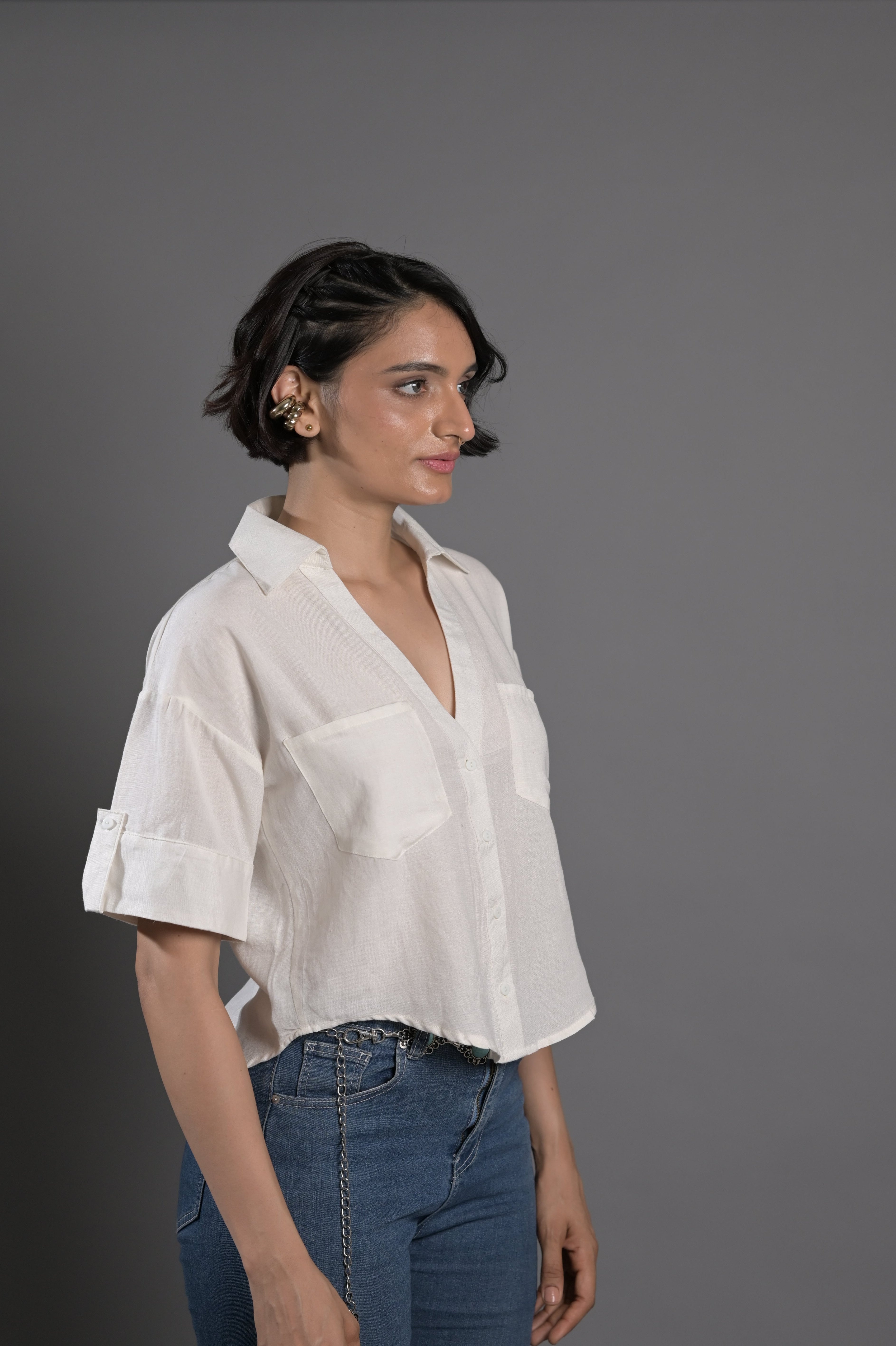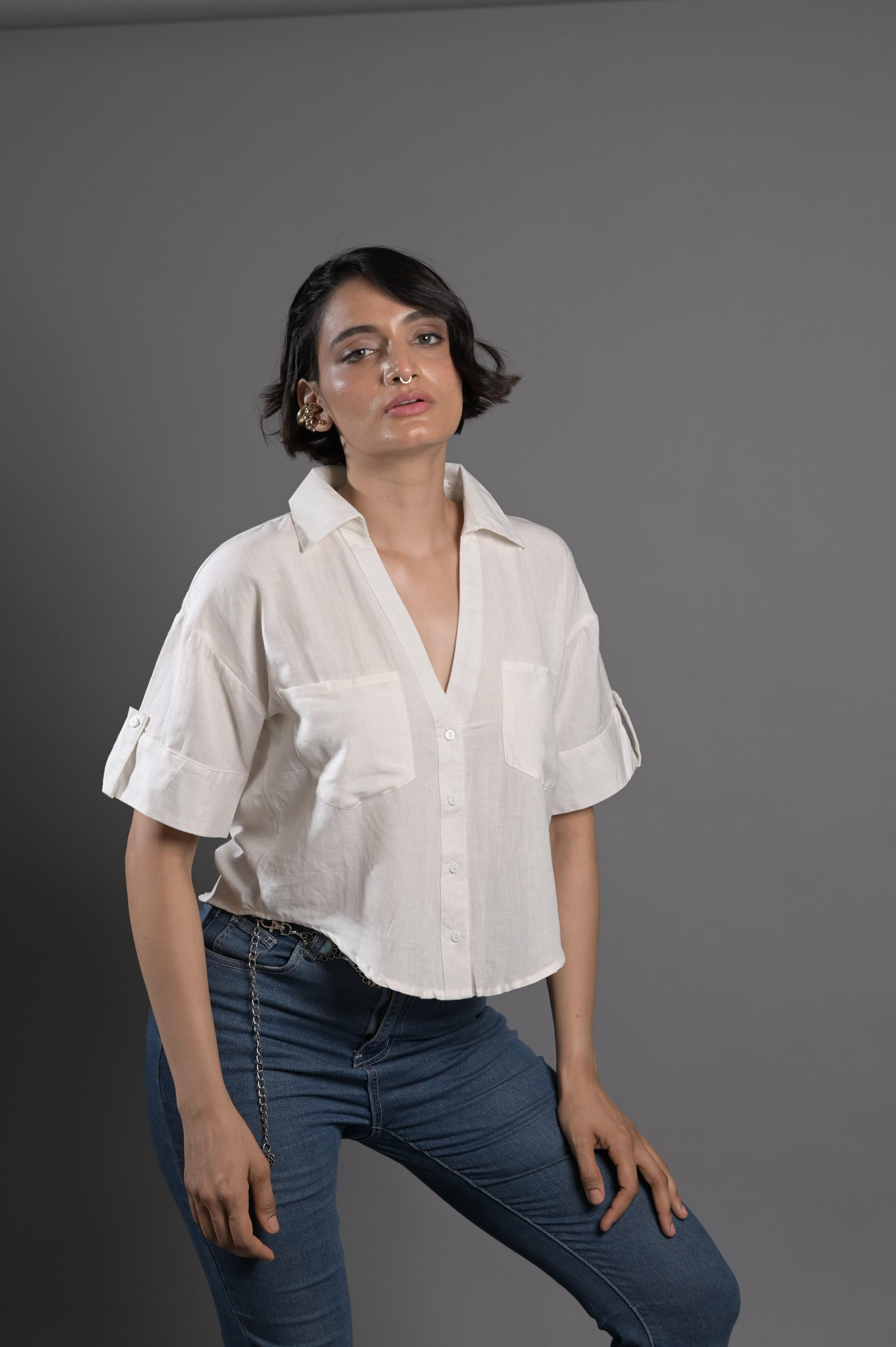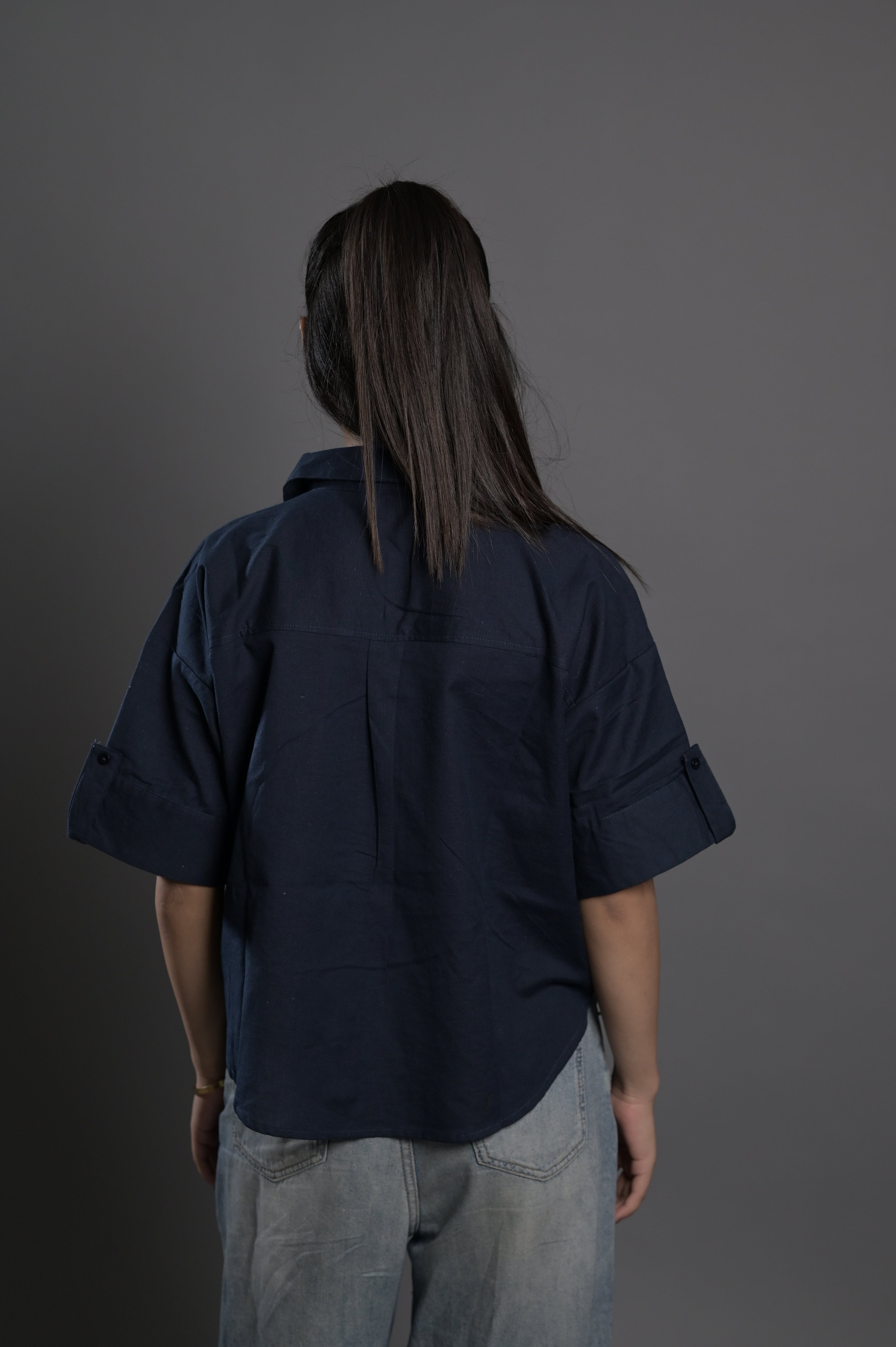 Cropped linen shirt in black with a boxy silhouette and button front. Classic summer staple.