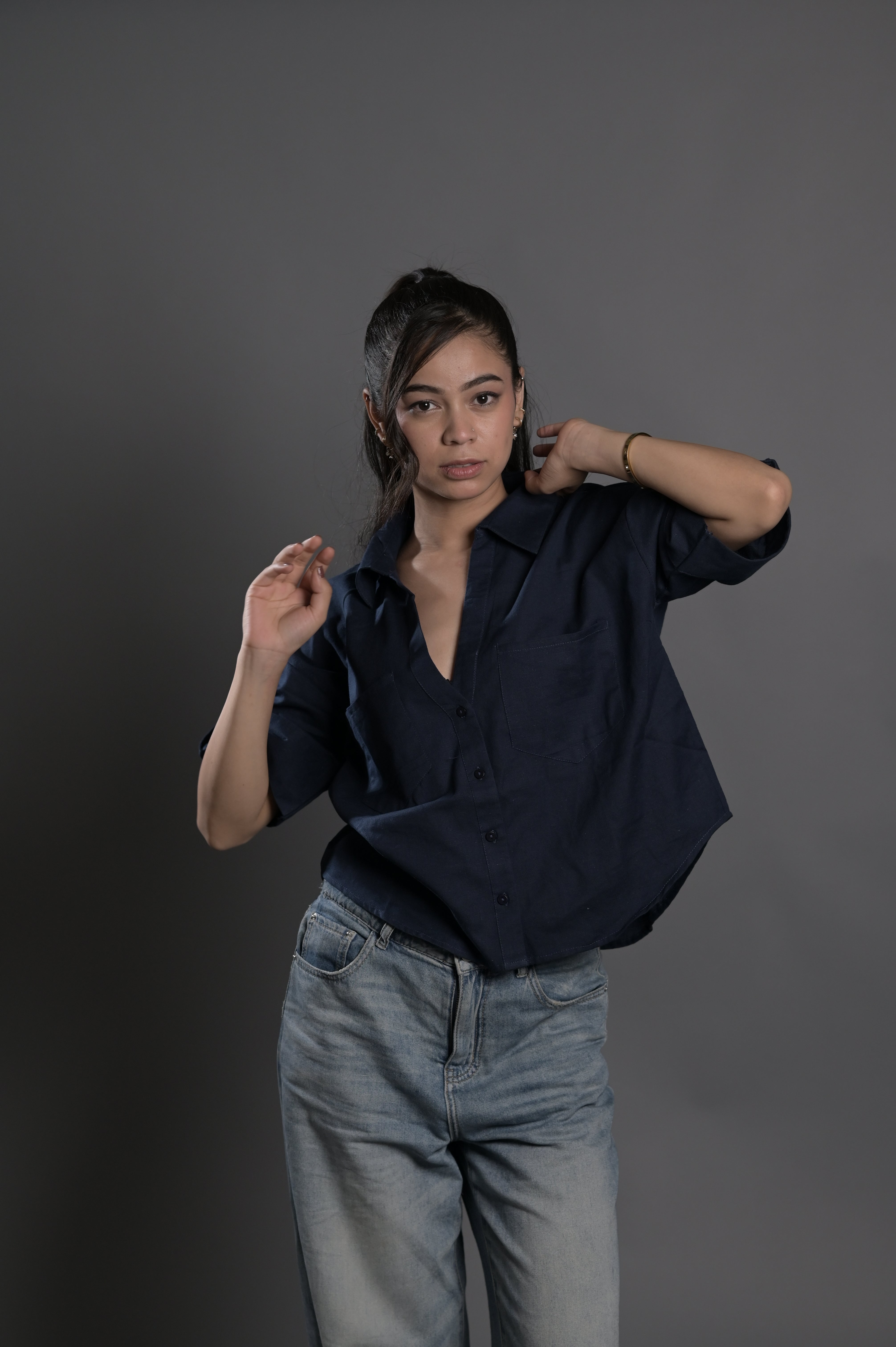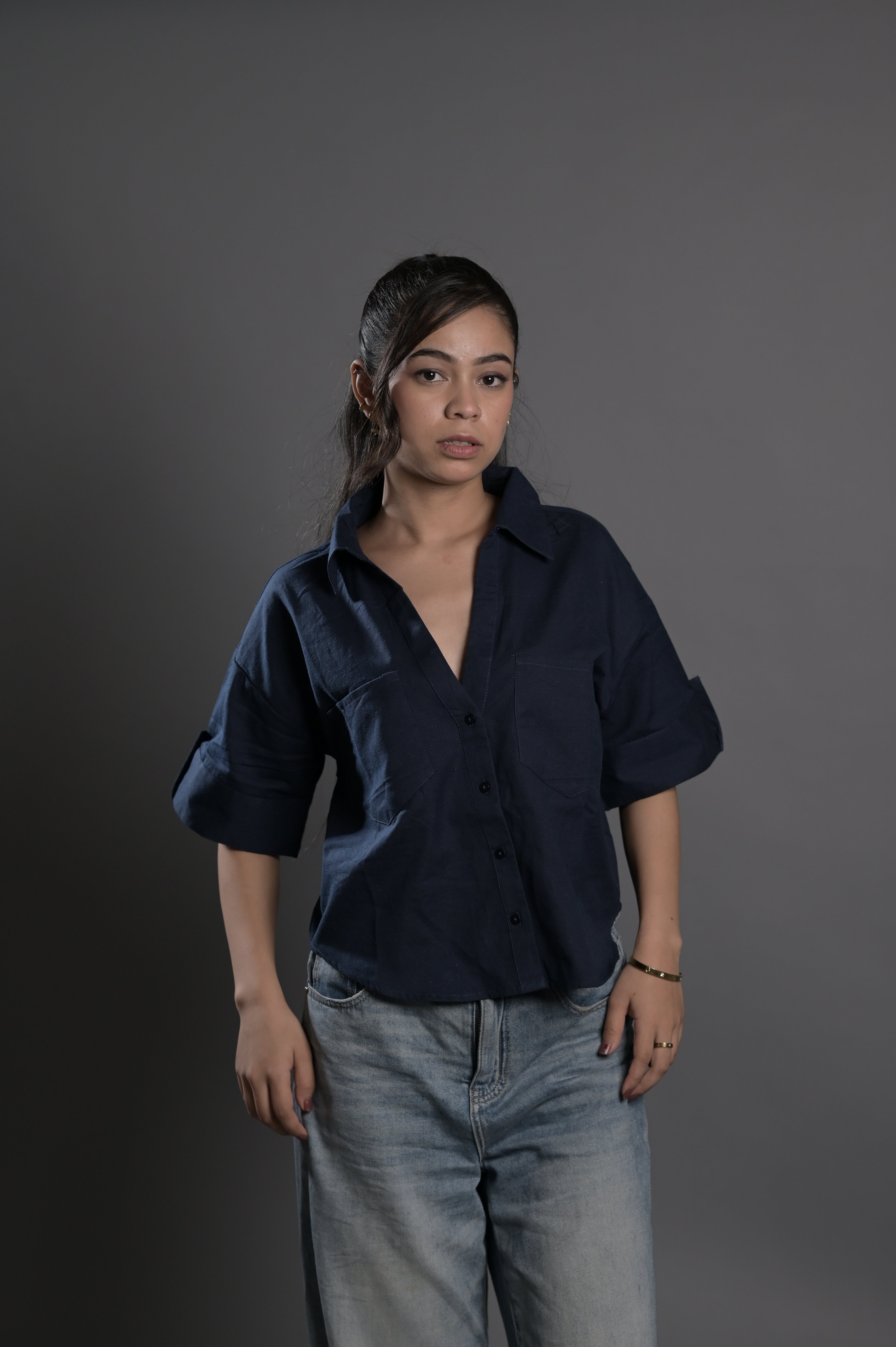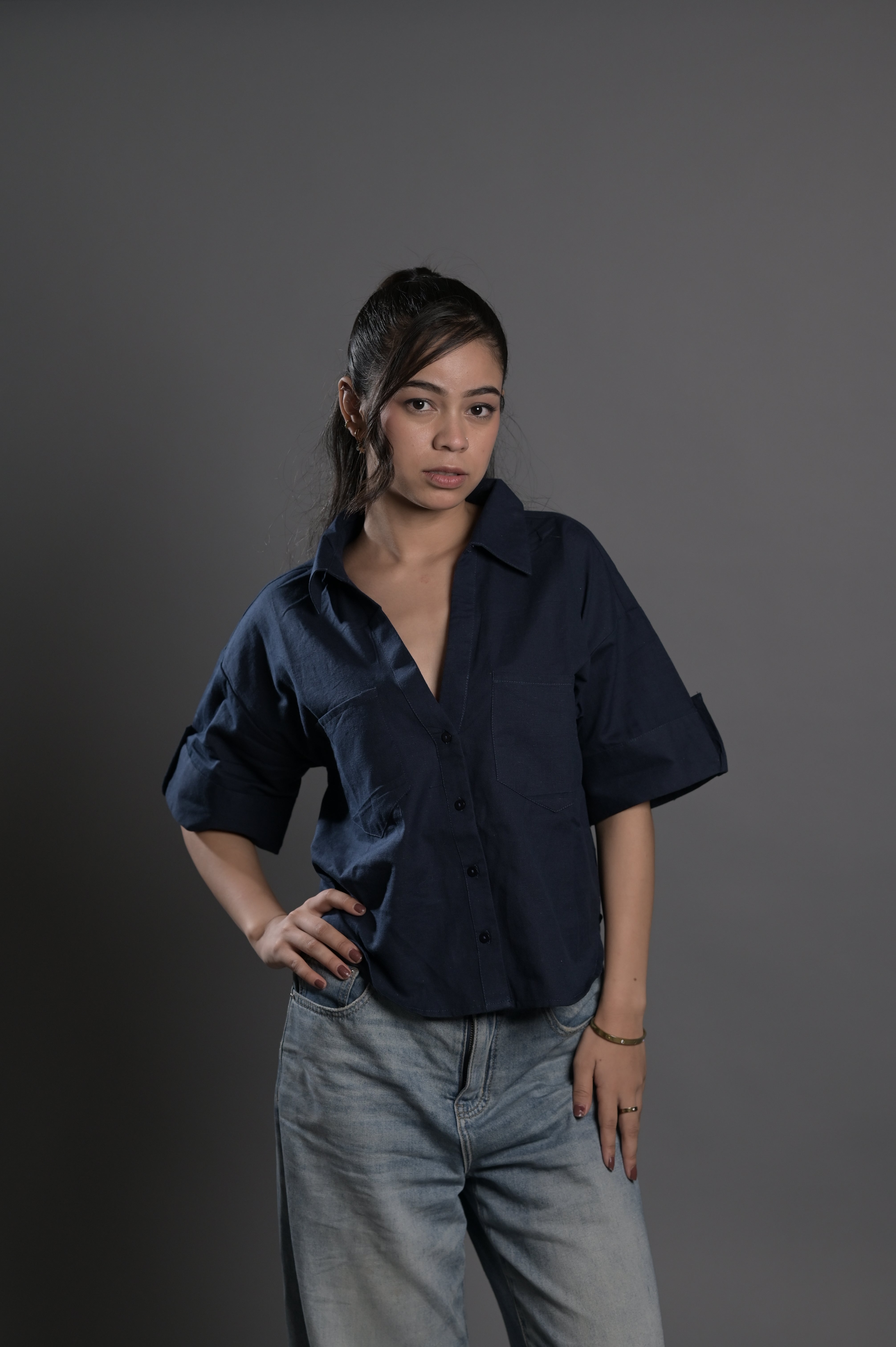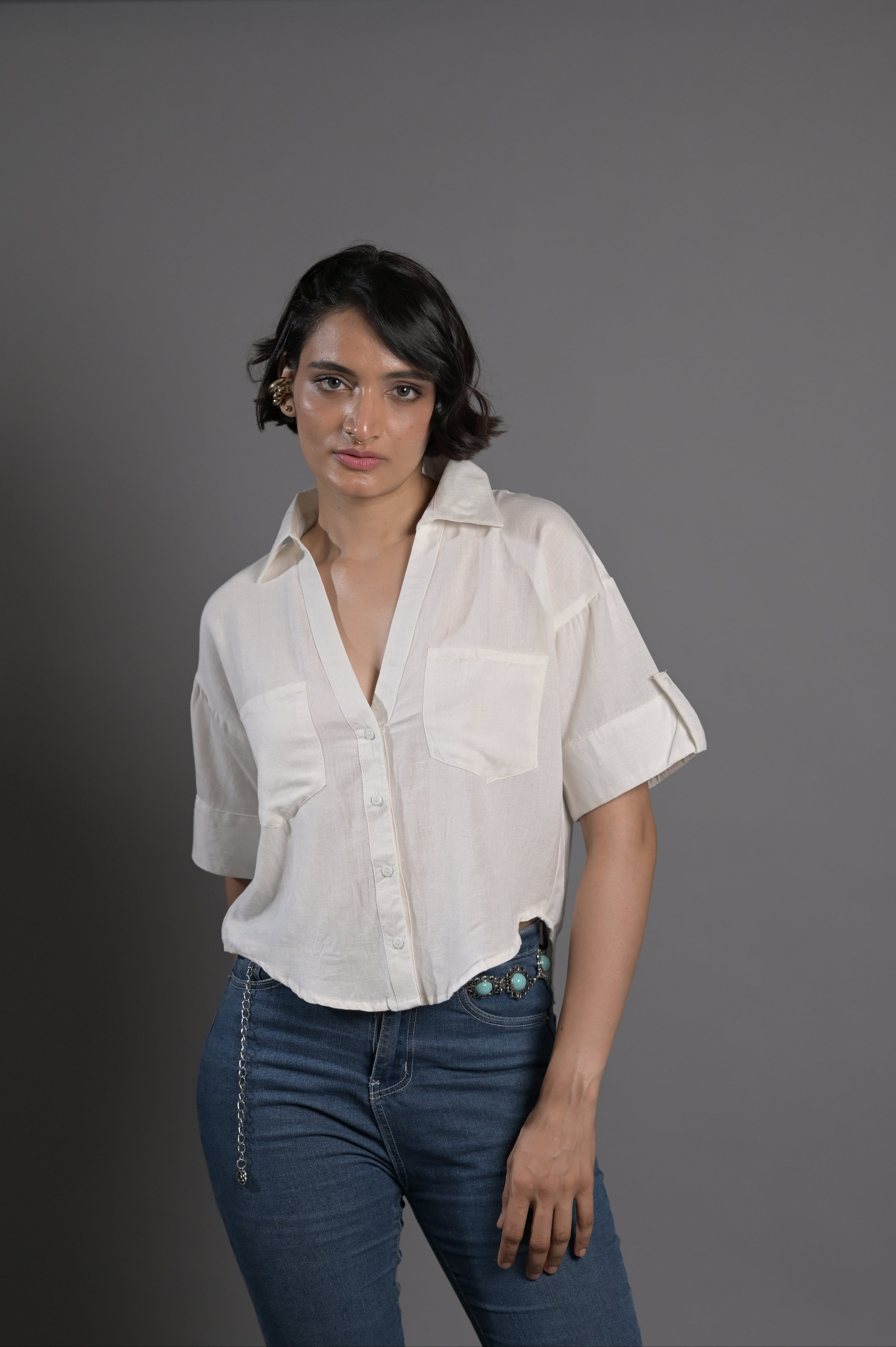 Cropped linen shirt in black with a boxy silhouette and button front. Classic summer staple.