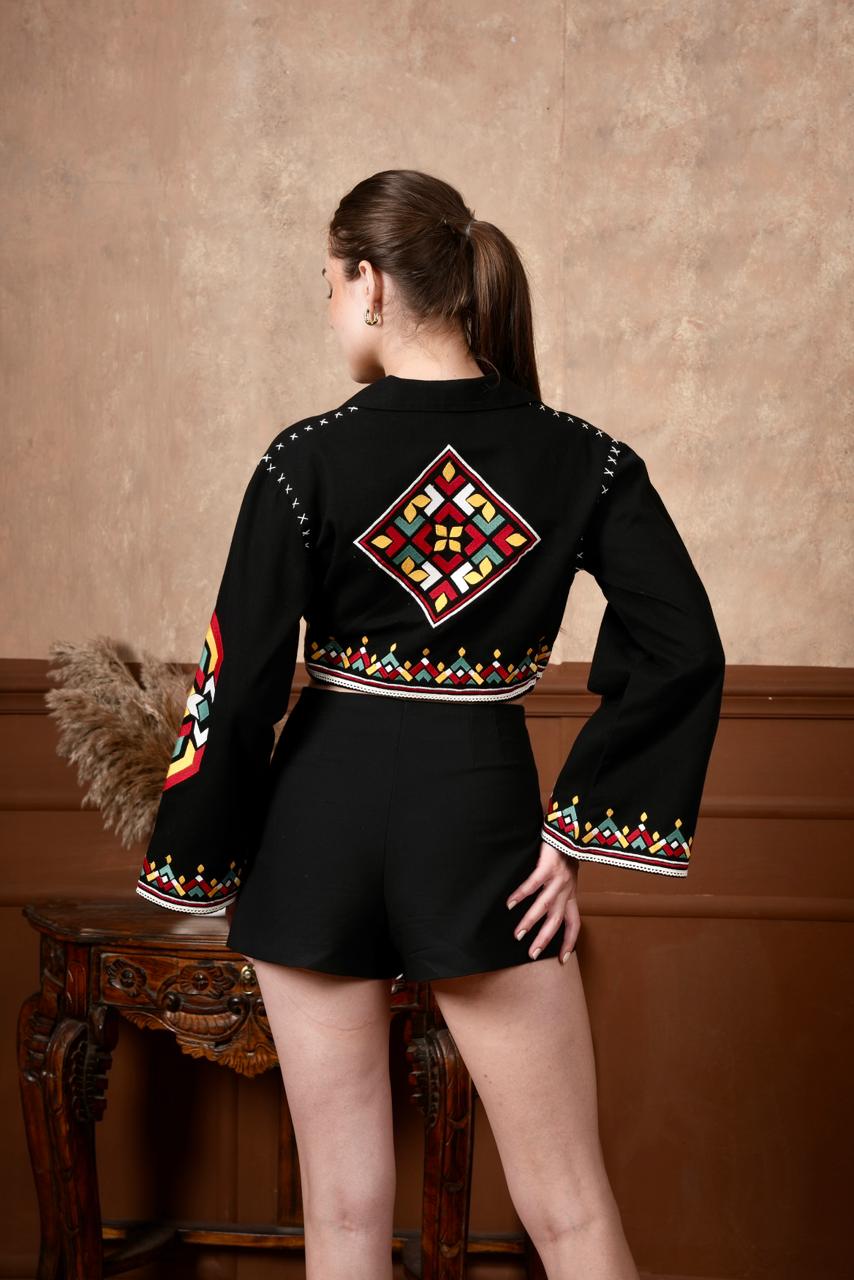 Black cropped jacket adorned with bold multicolored geometric embroidery in red,yellow,green and white. featuring a striking diamond motif at the back, intricate sleeve detailing and a patterned border at the hem for a statement making ethnic meets contempoorary look.