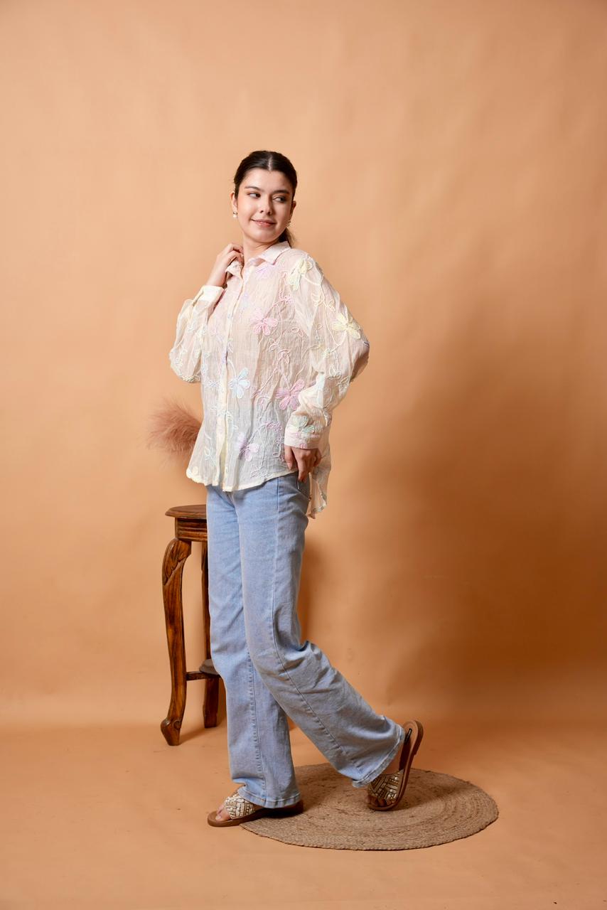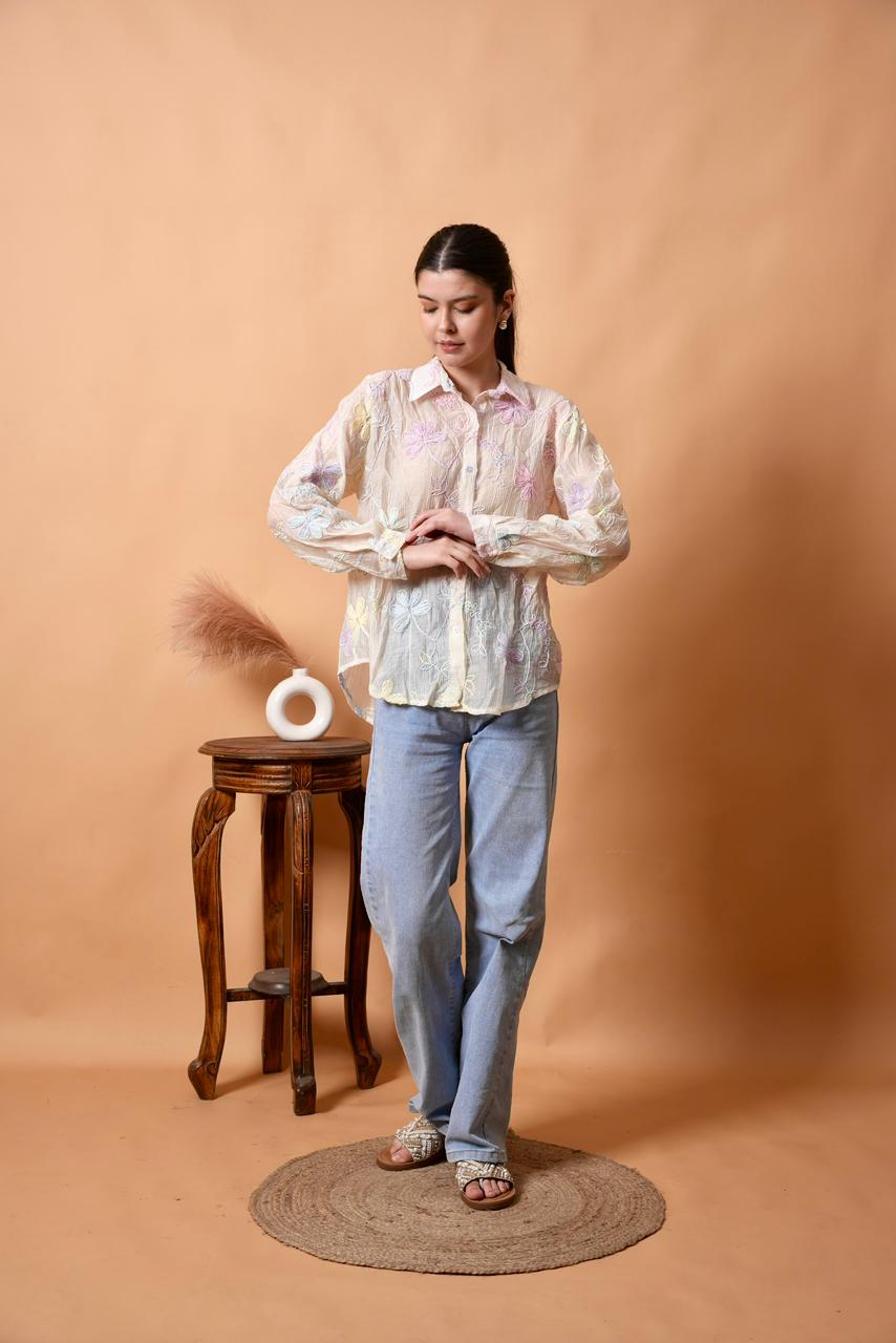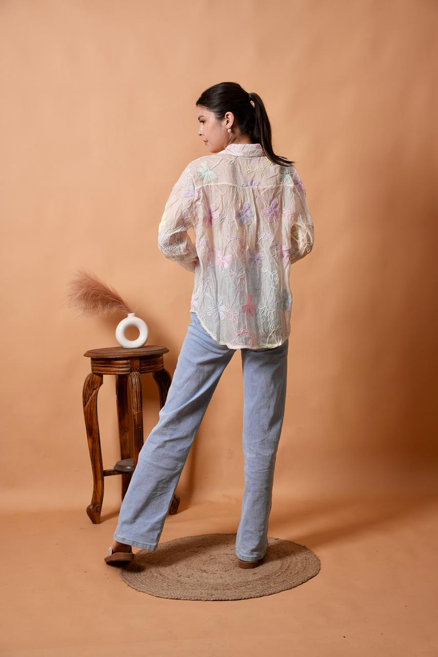 Ivory shirt adorned with pastel multicolored floral embroidery in a sheer organza blend.