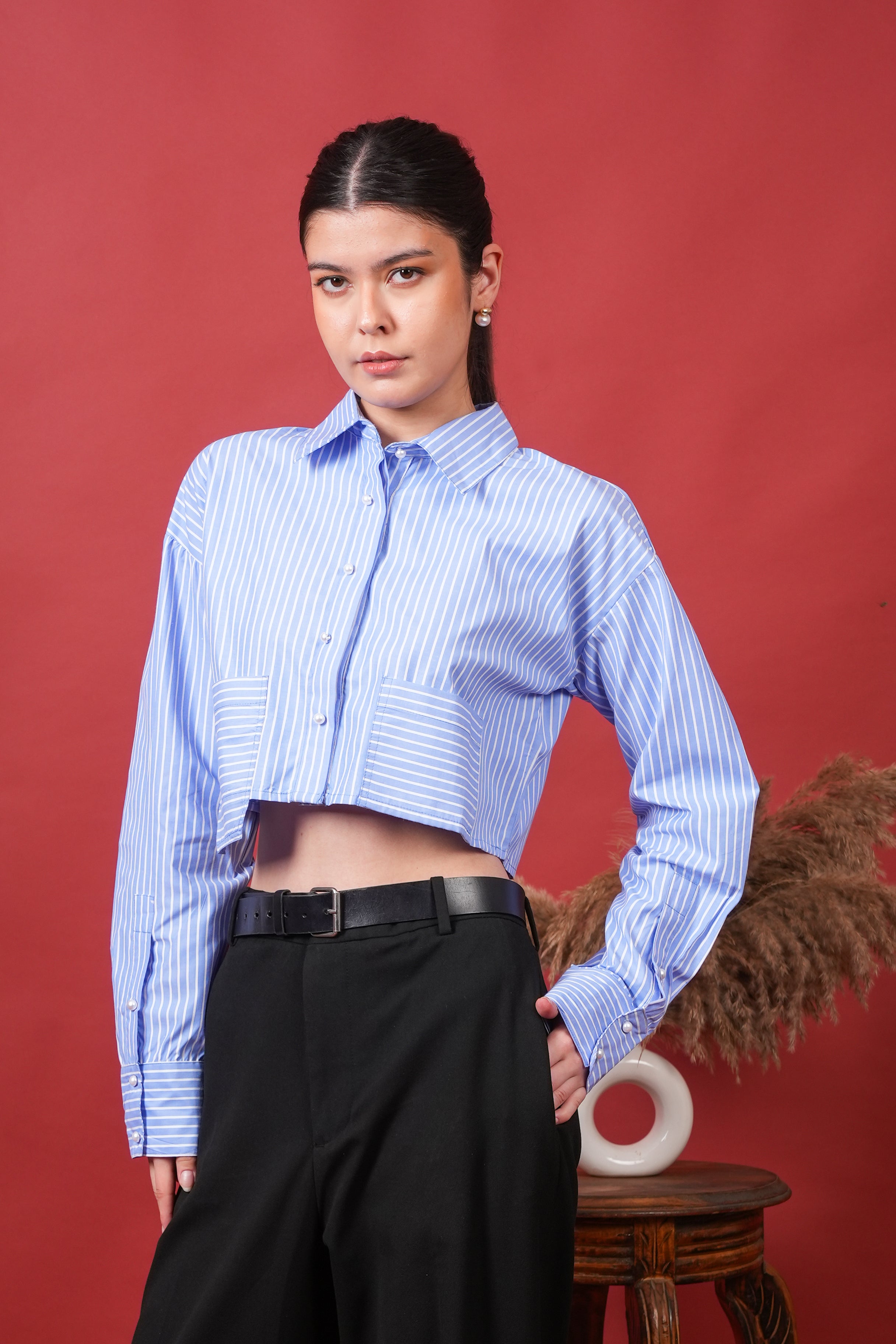 Women's Blue Stripe Crop Shirt
