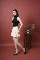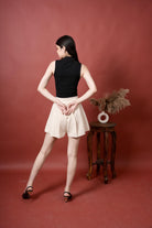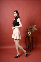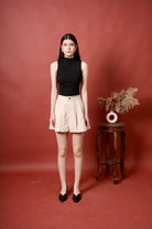 High- Waist pleated shorts with buttons detail, offering a chic look with thye comfort of shorts