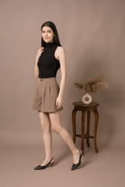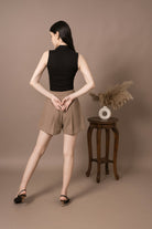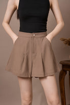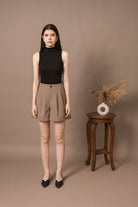 High- Waist pleated shorts with buttons detail, offering a chic look with thye comfort of shorts