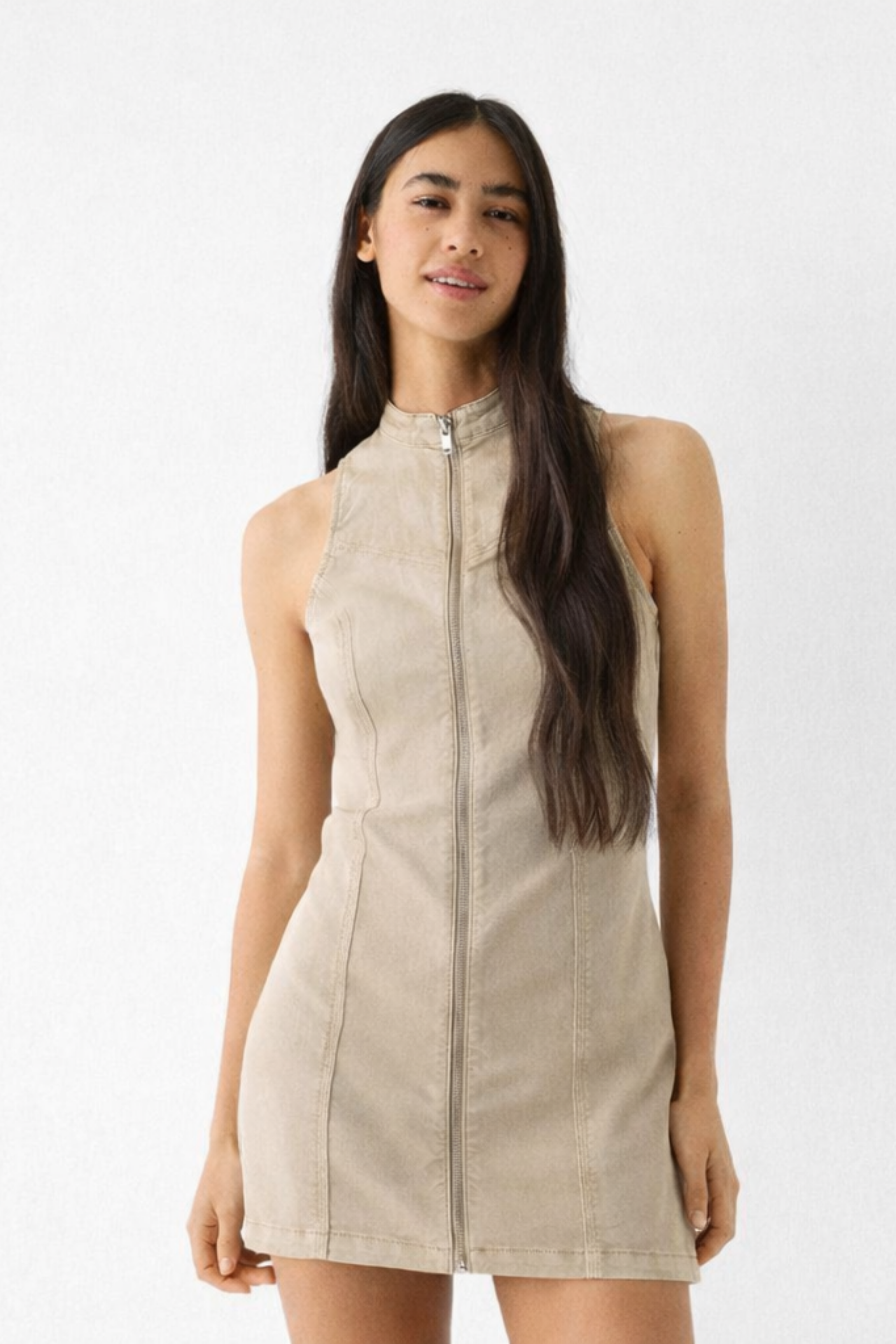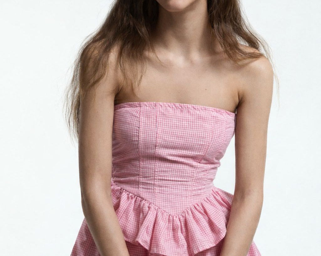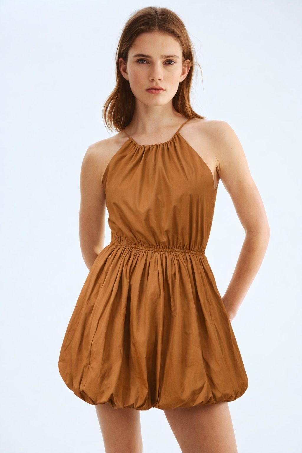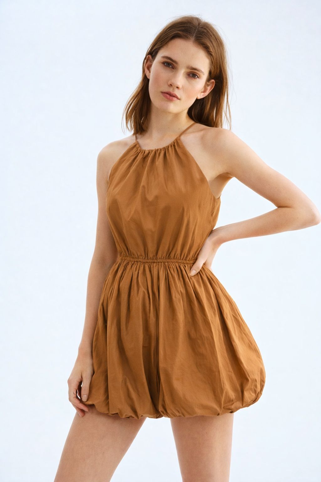 Halter Neck mini dress with a gathered nackline, Bubble hem for playful, voluminous silhouette.