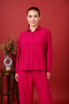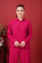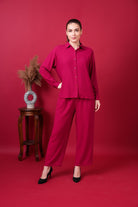 Pink co-ord set featuring a fitted ruched top and ribbed pants for a stylish casual vibe.