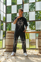 oversized co-ord set with graffiti-style abstract black print across the t-shirt and pants. Bold and artistic, this streetwear set is designed for those who like to stand out in casual and trendy fits.