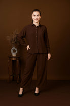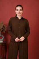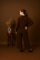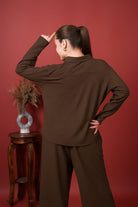 Wine co-ord set featuring a fitted ruched top and ribbed pants for a stylish casual vibe.