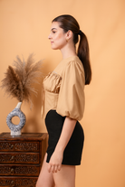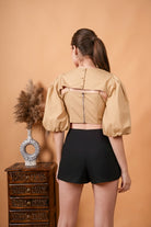 Cropped top with dramatic puff sleeve, a gathered bust with Drawstrings and structured corest waist with Metal zipper