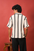 Relaxed-fit resort shirt in beige with bold black printed stripes. Features short sleeves, an open collar, and a breathable fabric ideal for holidays, casual evenings, or weekend getaways.