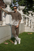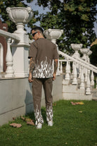 Statement co-ord set in earthy brown with bold white flame graphics along the hemline of both t-shirt and pants. A bold streetwear look for music festivals, nightlife, or weekend style.
