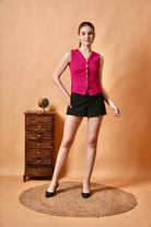 A sleeveless Pink top featuring a structred silhouette with a front overlap design.