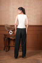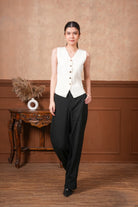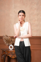 A sleeveless off white top featuring a structred silhouette with a front overlap design.