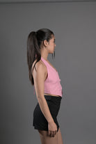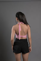 A chic pink gingham halter crop vest featuring a deep neckline, front button closure, and pointed hem for a flattering silhouette. Perfect for layering or wearing solo for a casual yet stylish look.