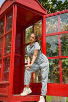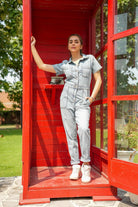 A versatile light blue denim jumpsuit featuring a button-down front, structured collar, utility chest pockets, and a cinched waistline that flatters the silhouette. Rolled hems and sneakers give it a trendy streetwear finish.