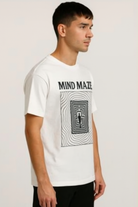 Optical illusion tee featuring a maze and figure in the center – striking and mind-bending.