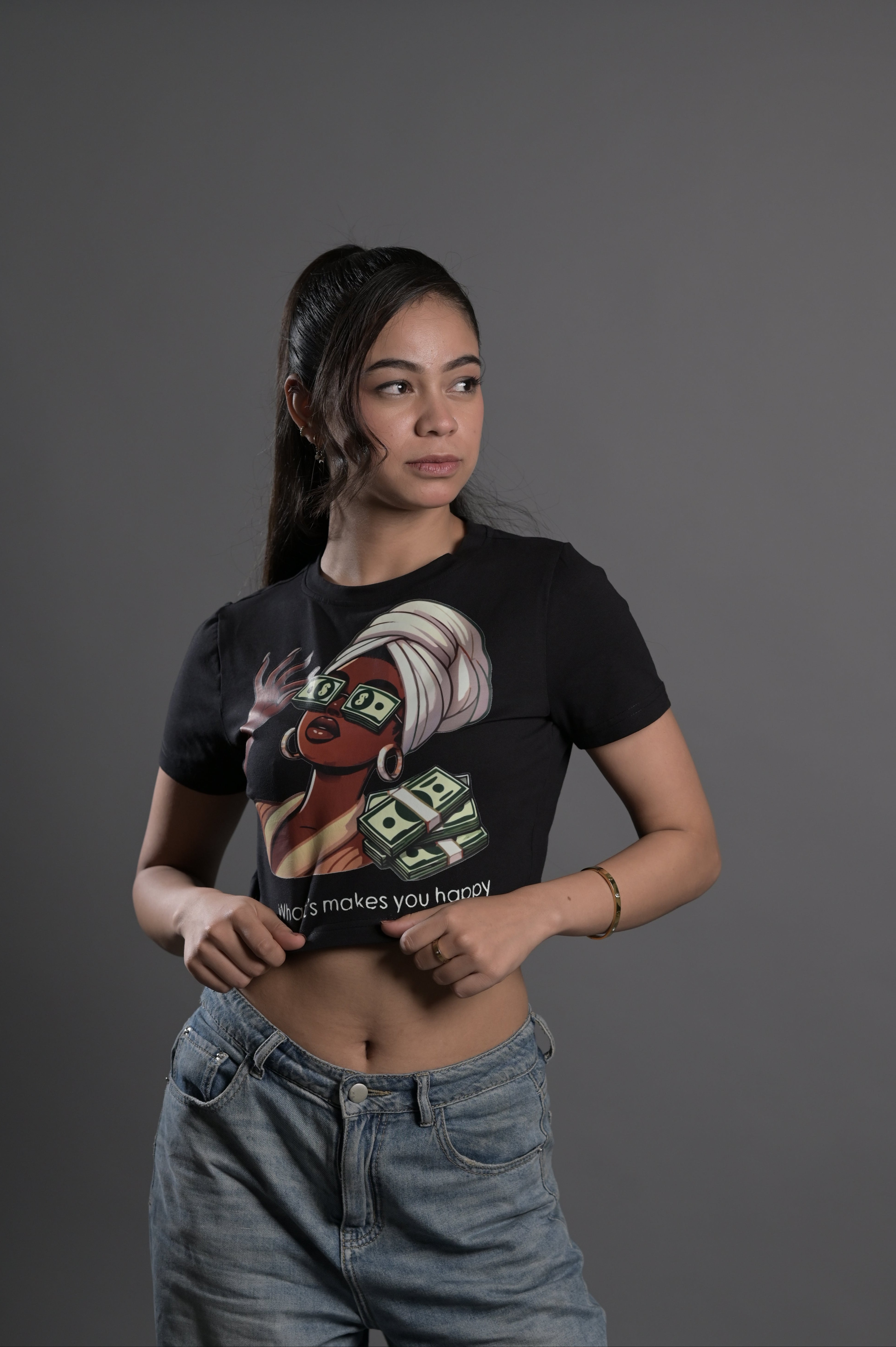 Illustration of a confident woman with money eye-glasses, captioned 'What’s makes you happy'