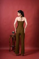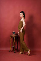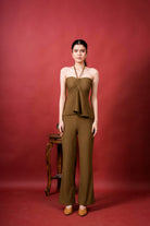 Olive green co-ord set featuring a fitted ruched top and ribbed pants for a stylish casual vibe.